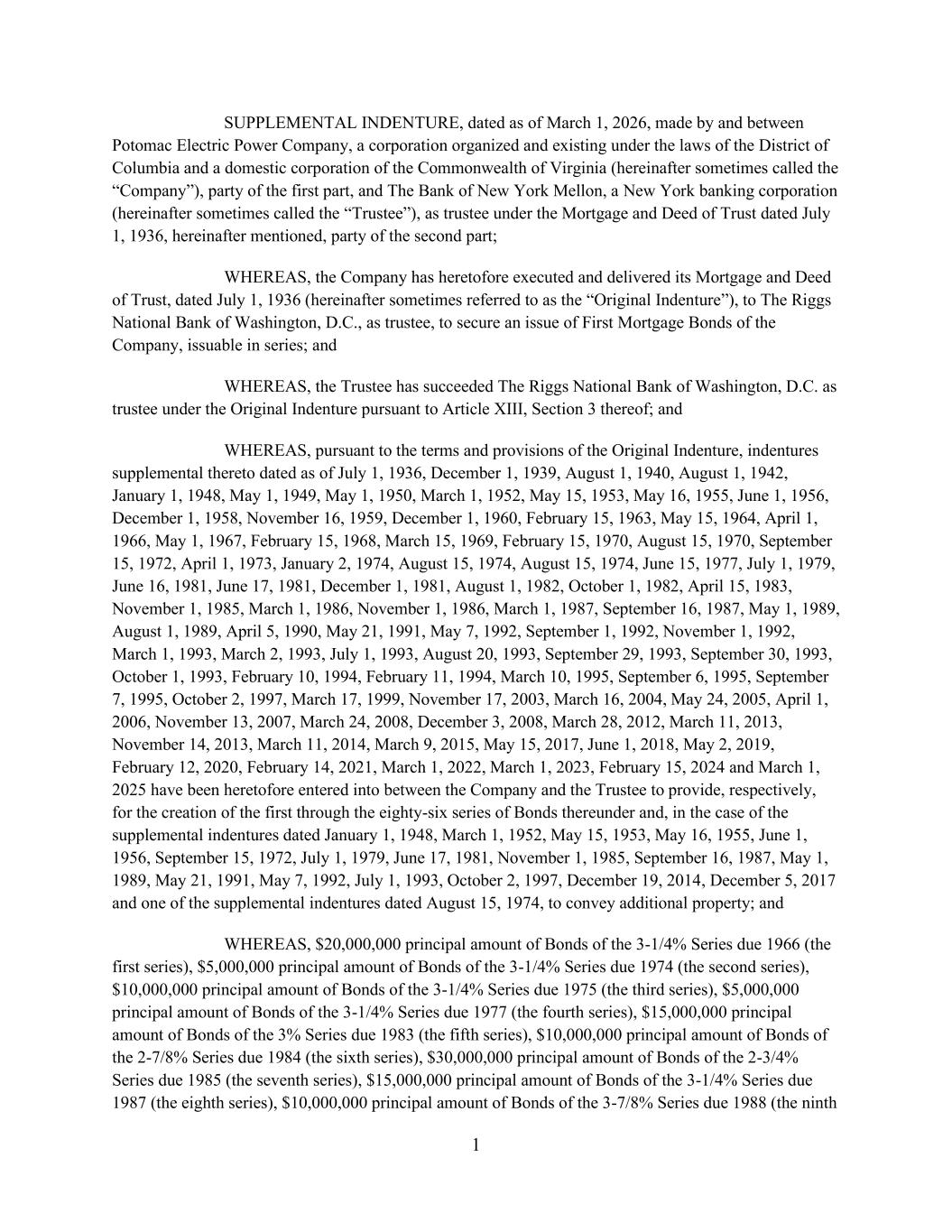 1 SUPPLEMENTAL INDENTURE, dated as of March 1, 2026, made by and between Potomac Electric Power Company, a corporation organized and existing under the laws of the District of Columbia and a domestic corporation of the Commonwealth of Virginia (hereinafter sometimes called the “Company”), party of the first part, and The Bank of New York Mellon, a New York banking corporation (hereinafter sometimes called the “Trustee”), as trustee under the Mortgage and Deed of Trust dated July 1, 1936, hereinafter mentioned, party of the second part; WHEREAS, the Company has heretofore executed and delivered its Mortgage and Deed of Trust, dated July 1, 1936 (hereinafter sometimes referred to as the “Original Indenture”), to The Riggs National Bank of Washington, D.C., as trustee, to secure an issue of First Mortgage Bonds of the Company, issuable in series; and WHEREAS, the Trustee has succeeded The Riggs National Bank of Washington, D.C. as trustee under the Original Indenture pursuant to Article XIII, Section 3 thereof; and WHEREAS, pursuant to the terms and provisions of the Original Indenture, indentures supplemental thereto dated as of July 1, 1936, December 1, 1939, August 1, 1940, August 1, 1942, January 1, 1948, May 1, 1949, May 1, 1950, March 1, 1952, May 15, 1953, May 16, 1955, June 1, 1956, December 1, 1958, November 16, 1959, December 1, 1960, February 15, 1963, May 15, 1964, April 1, 1966, May 1, 1967, February 15, 1968, March 15, 1969, February 15, 1970, August 15, 1970, September 15, 1972, April 1, 1973, January 2, 1974, August 15, 1974, August 15, 1974, June 15, 1977, July 1, 1979, June 16, 1981, June 17, 1981, December 1, 1981, August 1, 1982, October 1, 1982, April 15, 1983, November 1, 1985, March 1, 1986, November 1, 1986, March 1, 1987, September 16, 1987, May 1, 1989, August 1, 1989, April 5, 1990, May 21, 1991, May 7, 1992, September 1, 1992, November 1, 1992, March 1, 1993, March 2, 1993, July 1, 1993, August 20, 1993, September 29, 1993, September 30, 1993, October 1, 1993, February 10, 1994, February 11, 1994, March 10, 1995, September 6, 1995, September 7, 1995, October 2, 1997, March 17, 1999, November 17, 2003, March 16, 2004, May 24, 2005, April 1, 2006, November 13, 2007, March 24, 2008, December 3, 2008, March 28, 2012, March 11, 2013, November 14, 2013, March 11, 2014, March 9, 2015, May 15, 2017, June 1, 2018, May 2, 2019, February 12, 2020, February 14, 2021, March 1, 2022, March 1, 2023, February 15, 2024 and March 1, 2025 have been heretofore entered into between the Company and the Trustee to provide, respectively, for the creation of the first through the eighty-six series of Bonds thereunder and, in the case of the supplemental indentures dated January 1, 1948, March 1, 1952, May 15, 1953, May 16, 1955, June 1, 1956, September 15, 1972, July 1, 1979, June 17, 1981, November 1, 1985, September 16, 1987, May 1, 1989, May 21, 1991, May 7, 1992, July 1, 1993, October 2, 1997, December 19, 2014, December 5, 2017 and one of the supplemental indentures dated August 15, 1974, to convey additional property; and WHEREAS, $20,000,000 principal amount of Bonds of the 3-1/4% Series due 1966 (the first series), $5,000,000 principal amount of Bonds of the 3-1/4% Series due 1974 (the second series), $10,000,000 principal amount of Bonds of the 3-1/4% Series due 1975 (the third series), $5,000,000 principal amount of Bonds of the 3-1/4% Series due 1977 (the fourth series), $15,000,000 principal amount of Bonds of the 3% Series due 1983 (the fifth series), $10,000,000 principal amount of Bonds of the 2-7/8% Series due 1984 (the sixth series), $30,000,000 principal amount of Bonds of the 2-3/4% Series due 1985 (the seventh series), $15,000,000 principal amount of Bonds of the 3-1/4% Series due 1987 (the eighth series), $10,000,000 principal amount of Bonds of the 3-7/8% Series due 1988 (the ninth