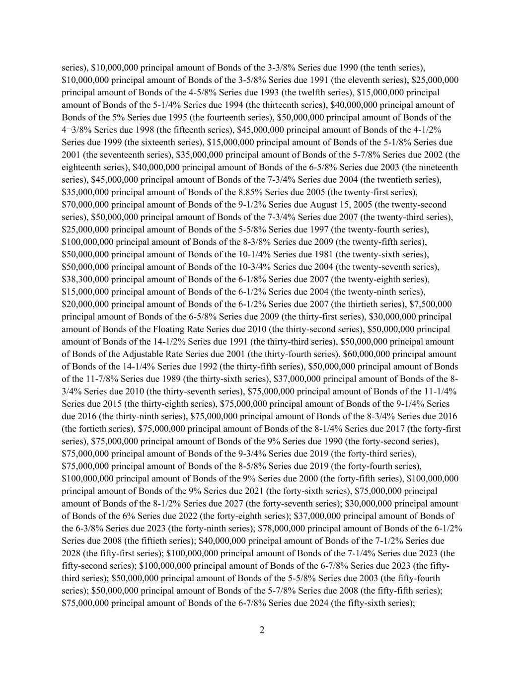 2 series), $10,000,000 principal amount of Bonds of the 3-3/8% Series due 1990 (the tenth series), $10,000,000 principal amount of Bonds of the 3-5/8% Series due 1991 (the eleventh series), $25,000,000 principal amount of Bonds of the 4-5/8% Series due 1993 (the twelfth series), $15,000,000 principal amount of Bonds of the 5-1/4% Series due 1994 (the thirteenth series), $40,000,000 principal amount of Bonds of the 5% Series due 1995 (the fourteenth series), $50,000,000 principal amount of Bonds of the 4¬3/8% Series due 1998 (the fifteenth series), $45,000,000 principal amount of Bonds of the 4-1/2% Series due 1999 (the sixteenth series), $15,000,000 principal amount of Bonds of the 5-1/8% Series due 2001 (the seventeenth series), $35,000,000 principal amount of Bonds of the 5-7/8% Series due 2002 (the eighteenth series), $40,000,000 principal amount of Bonds of the 6-5/8% Series due 2003 (the nineteenth series), $45,000,000 principal amount of Bonds of the 7-3/4% Series due 2004 (the twentieth series), $35,000,000 principal amount of Bonds of the 8.85% Series due 2005 (the twenty-first series), $70,000,000 principal amount of Bonds of the 9-1/2% Series due August 15, 2005 (the twenty-second series), $50,000,000 principal amount of Bonds of the 7-3/4% Series due 2007 (the twenty-third series), $25,000,000 principal amount of Bonds of the 5-5/8% Series due 1997 (the twenty-fourth series), $100,000,000 principal amount of Bonds of the 8-3/8% Series due 2009 (the twenty-fifth series), $50,000,000 principal amount of Bonds of the 10-1/4% Series due 1981 (the twenty-sixth series), $50,000,000 principal amount of Bonds of the 10-3/4% Series due 2004 (the twenty-seventh series), $38,300,000 principal amount of Bonds of the 6-1/8% Series due 2007 (the twenty-eighth series), $15,000,000 principal amount of Bonds of the 6-1/2% Series due 2004 (the twenty-ninth series), $20,000,000 principal amount of Bonds of the 6-1/2% Series due 2007 (the thirtieth series), $7,500,000 principal amount of Bonds of the 6-5/8% Series due 2009 (the thirty-first series), $30,000,000 principal amount of Bonds of the Floating Rate Series due 2010 (the thirty-second series), $50,000,000 principal amount of Bonds of the 14-1/2% Series due 1991 (the thirty-third series), $50,000,000 principal amount of Bonds of the Adjustable Rate Series due 2001 (the thirty-fourth series), $60,000,000 principal amount of Bonds of the 14-1/4% Series due 1992 (the thirty-fifth series), $50,000,000 principal amount of Bonds of the 11-7/8% Series due 1989 (the thirty-sixth series), $37,000,000 principal amount of Bonds of the 8- 3/4% Series due 2010 (the thirty-seventh series), $75,000,000 principal amount of Bonds of the 11-1/4% Series due 2015 (the thirty-eighth series), $75,000,000 principal amount of Bonds of the 9-1/4% Series due 2016 (the thirty-ninth series), $75,000,000 principal amount of Bonds of the 8-3/4% Series due 2016 (the fortieth series), $75,000,000 principal amount of Bonds of the 8-1/4% Series due 2017 (the forty-first series), $75,000,000 principal amount of Bonds of the 9% Series due 1990 (the forty-second series), $75,000,000 principal amount of Bonds of the 9-3/4% Series due 2019 (the forty-third series), $75,000,000 principal amount of Bonds of the 8-5/8% Series due 2019 (the forty-fourth series), $100,000,000 principal amount of Bonds of the 9% Series due 2000 (the forty-fifth series), $100,000,000 principal amount of Bonds of the 9% Series due 2021 (the forty-sixth series), $75,000,000 principal amount of Bonds of the 8-1/2% Series due 2027 (the forty-seventh series); $30,000,000 principal amount of Bonds of the 6% Series due 2022 (the forty-eighth series); $37,000,000 principal amount of Bonds of the 6-3/8% Series due 2023 (the forty-ninth series); $78,000,000 principal amount of Bonds of the 6-1/2% Series due 2008 (the fiftieth series); $40,000,000 principal amount of Bonds of the 7-1/2% Series due 2028 (the fifty-first series); $100,000,000 principal amount of Bonds of the 7-1/4% Series due 2023 (the fifty-second series); $100,000,000 principal amount of Bonds of the 6-7/8% Series due 2023 (the fifty- third series); $50,000,000 principal amount of Bonds of the 5-5/8% Series due 2003 (the fifty-fourth series); $50,000,000 principal amount of Bonds of the 5-7/8% Series due 2008 (the fifty-fifth series); $75,000,000 principal amount of Bonds of the 6-7/8% Series due 2024 (the fifty-sixth series);