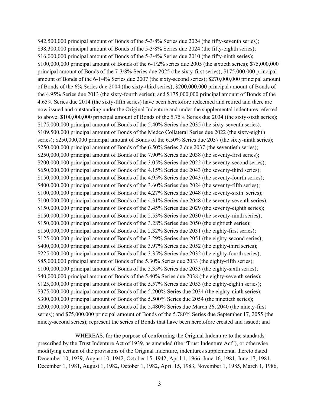 3 $42,500,000 principal amount of Bonds of the 5-3/8% Series due 2024 (the fifty-seventh series); $38,300,000 principal amount of Bonds of the 5-3/8% Series due 2024 (the fifty-eighth series); $16,000,000 principal amount of Bonds of the 5-3/4% Series due 2010 (the fifty-ninth series); $100,000,000 principal amount of Bonds of the 6-1/2% series due 2005 (the sixtieth series); $75,000,000 principal amount of Bonds of the 7-3/8% Series due 2025 (the sixty-first series); $175,000,000 principal amount of Bonds of the 6-1/4% Series due 2007 (the sixty-second series); $270,000,000 principal amount of Bonds of the 6% Series due 2004 (the sixty-third series); $200,000,000 principal amount of Bonds of the 4.95% Series due 2013 (the sixty-fourth series); and $175,000,000 principal amount of Bonds of the 4.65% Series due 2014 (the sixty-fifth series) have been heretofore redeemed and retired and there are now issued and outstanding under the Original Indenture and under the supplemental indentures referred to above: $100,000,000 principal amount of Bonds of the 5.75% Series due 2034 (the sixty-sixth series); $175,000,000 principal amount of Bonds of the 5.40% Series due 2035 (the sixty-seventh series); $109,500,000 principal amount of Bonds of the Medco Collateral Series due 2022 (the sixty-eighth series); $250,000,000 principal amount of Bonds of the 6.50% Series due 2037 (the sixty-ninth series); $250,000,000 principal amount of Bonds of the 6.50% Series 2 due 2037 (the seventieth series); $250,000,000 principal amount of Bonds of the 7.90% Series due 2038 (the seventy-first series); $200,000,000 principal amount of Bonds of the 3.05% Series due 2022 (the seventy-second series); $650,000,000 principal amount of Bonds of the 4.15% Series due 2043 (the seventy-third series); $150,000,000 principal amount of Bonds of the 4.95% Series due 2043 (the seventy-fourth series); $400,000,000 principal amount of Bonds of the 3.60% Series due 2024 (the seventy-fifth series); $100,000,000 principal amount of Bonds of the 4.27% Series due 2048 (the seventy-sixth series); $100,000,000 principal amount of Bonds of the 4.31% Series due 2048 (the seventy-seventh series); $150,000,000 principal amount of Bonds of the 3.45% Series due 2029 (the seventy-eighth series); $150,000,000 principal amount of Bonds of the 2.53% Series due 2030 (the seventy-ninth series); $150,000,000 principal amount of Bonds of the 3.28% Series due 2050 (the eightieth series); $150,000,000 principal amount of Bonds of the 2.32% Series due 2031 (the eighty-first series); $125,000,000 principal amount of Bonds of the 3.29% Series due 2051 (the eighty-second series); $400,000,000 principal amount of Bonds of the 3.97% Series due 2052 (the eighty-third series); $225,000,000 principal amount of Bonds of the 3.35% Series due 2032 (the eighty-fourth series); $85,000,000 principal amount of Bonds of the 5.30% Series due 2033 (the eighty-fifth series); $100,000,000 principal amount of Bonds of the 5.35% Series due 2033 (the eighty-sixth series); $40,000,000 principal amount of Bonds of the 5.40% Series due 2038 (the eighty-seventh series); $125,000,000 principal amount of Bonds of the 5.57% Series due 2053 (the eighty-eighth series); $375,000,000 principal amount of Bonds of the 5.200% Series due 2034 (the eighty-ninth series); $300,000,000 principal amount of Bonds of the 5.500% Series due 2054 (the ninetieth series); $200,000,000 principal amount of Bonds of the 5.480% Series due March 26, 2040 (the ninety-first series); and $75,000,000 principal amount of Bonds of the 5.780% Series due September 17, 2055 (the ninety-second series); represent the series of Bonds that have been heretofore created and issued; and WHEREAS, for the purpose of conforming the Original Indenture to the standards prescribed by the Trust Indenture Act of 1939, as amended (the “Trust Indenture Act”), or otherwise modifying certain of the provisions of the Original Indenture, indentures supplemental thereto dated December 10, 1939, August 10, 1942, October 15, 1942, April 1, 1966, June 16, 1981, June 17, 1981, December 1, 1981, August 1, 1982, October 1, 1982, April 15, 1983, November 1, 1985, March 1, 1986,