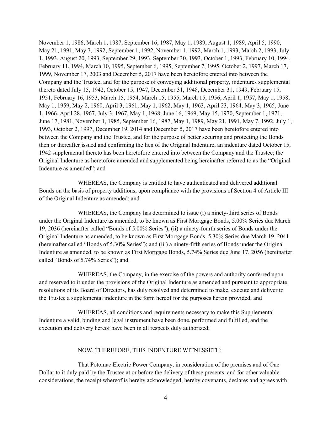 4 November 1, 1986, March 1, 1987, September 16, 1987, May 1, 1989, August 1, 1989, April 5, 1990, May 21, 1991, May 7, 1992, September 1, 1992, November 1, 1992, March 1, 1993, March 2, 1993, July 1, 1993, August 20, 1993, September 29, 1993, September 30, 1993, October 1, 1993, February 10, 1994, February 11, 1994, March 10, 1995, September 6, 1995, September 7, 1995, October 2, 1997, March 17, 1999, November 17, 2003 and December 5, 2017 have been heretofore entered into between the Company and the Trustee, and for the purpose of conveying additional property, indentures supplemental thereto dated July 15, 1942, October 15, 1947, December 31, 1948, December 31, 1949, February 15, 1951, February 16, 1953, March 15, 1954, March 15, 1955, March 15, 1956, April 1, 1957, May 1, 1958, May 1, 1959, May 2, 1960, April 3, 1961, May 1, 1962, May 1, 1963, April 23, 1964, May 3, 1965, June 1, 1966, April 28, 1967, July 3, 1967, May 1, 1968, June 16, 1969, May 15, 1970, September 1, 1971, June 17, 1981, November 1, 1985, September 16, 1987, May 1, 1989, May 21, 1991, May 7, 1992, July 1, 1993, October 2, 1997, December 19, 2014 and December 5, 2017 have been heretofore entered into between the Company and the Trustee, and for the purpose of better securing and protecting the Bonds then or thereafter issued and confirming the lien of the Original Indenture, an indenture dated October 15, 1942 supplemental thereto has been heretofore entered into between the Company and the Trustee; the Original Indenture as heretofore amended and supplemented being hereinafter referred to as the “Original Indenture as amended”; and WHEREAS, the Company is entitled to have authenticated and delivered additional Bonds on the basis of property additions, upon compliance with the provisions of Section 4 of Article III of the Original Indenture as amended; and WHEREAS, the Company has determined to issue (i) a ninety-third series of Bonds under the Original Indenture as amended, to be known as First Mortgage Bonds, 5.00% Series due March 19, 2036 (hereinafter called “Bonds of 5.00% Series”), (ii) a ninety-fourth series of Bonds under the Original Indenture as amended, to be known as First Mortgage Bonds, 5.30% Series due March 19, 2041 (hereinafter called “Bonds of 5.30% Series”); and (iii) a ninety-fifth series of Bonds under the Original Indenture as amended, to be known as First Mortgage Bonds, 5.74% Series due June 17, 2056 (hereinafter called “Bonds of 5.74% Series”); and WHEREAS, the Company, in the exercise of the powers and authority conferred upon and reserved to it under the provisions of the Original Indenture as amended and pursuant to appropriate resolutions of its Board of Directors, has duly resolved and determined to make, execute and deliver to the Trustee a supplemental indenture in the form hereof for the purposes herein provided; and WHEREAS, all conditions and requirements necessary to make this Supplemental Indenture a valid, binding and legal instrument have been done, performed and fulfilled, and the execution and delivery hereof have been in all respects duly authorized; NOW, THEREFORE, THIS INDENTURE WITNESSETH: That Potomac Electric Power Company, in consideration of the premises and of One Dollar to it duly paid by the Trustee at or before the delivery of these presents, and for other valuable considerations, the receipt whereof is hereby acknowledged, hereby covenants, declares and agrees with