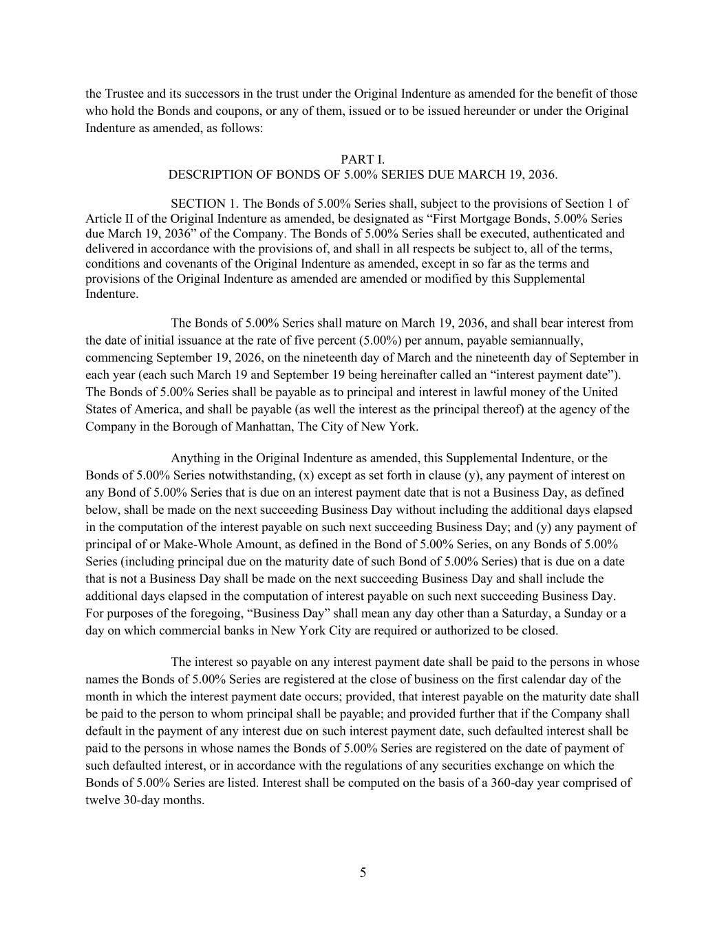 5 the Trustee and its successors in the trust under the Original Indenture as amended for the benefit of those who hold the Bonds and coupons, or any of them, issued or to be issued hereunder or under the Original Indenture as amended, as follows: PART I. DESCRIPTION OF BONDS OF 5.00% SERIES DUE MARCH 19, 2036. SECTION 1. The Bonds of 5.00% Series shall, subject to the provisions of Section 1 of Article II of the Original Indenture as amended, be designated as “First Mortgage Bonds, 5.00% Series due March 19, 2036” of the Company. The Bonds of 5.00% Series shall be executed, authenticated and delivered in accordance with the provisions of, and shall in all respects be subject to, all of the terms, conditions and covenants of the Original Indenture as amended, except in so far as the terms and provisions of the Original Indenture as amended are amended or modified by this Supplemental Indenture. The Bonds of 5.00% Series shall mature on March 19, 2036, and shall bear interest from the date of initial issuance at the rate of five percent (5.00%) per annum, payable semiannually, commencing September 19, 2026, on the nineteenth day of March and the nineteenth day of September in each year (each such March 19 and September 19 being hereinafter called an “interest payment date”). The Bonds of 5.00% Series shall be payable as to principal and interest in lawful money of the United States of America, and shall be payable (as well the interest as the principal thereof) at the agency of the Company in the Borough of Manhattan, The City of New York. Anything in the Original Indenture as amended, this Supplemental Indenture, or the Bonds of 5.00% Series notwithstanding, (x) except as set forth in clause (y), any payment of interest on any Bond of 5.00% Series that is due on an interest payment date that is not a Business Day, as defined below, shall be made on the next succeeding Business Day without including the additional days elapsed in the computation of the interest payable on such next succeeding Business Day; and (y) any payment of principal of or Make-Whole Amount, as defined in the Bond of 5.00% Series, on any Bonds of 5.00% Series (including principal due on the maturity date of such Bond of 5.00% Series) that is due on a date that is not a Business Day shall be made on the next succeeding Business Day and shall include the additional days elapsed in the computation of interest payable on such next succeeding Business Day. For purposes of the foregoing, “Business Day” shall mean any day other than a Saturday, a Sunday or a day on which commercial banks in New York City are required or authorized to be closed. The interest so payable on any interest payment date shall be paid to the persons in whose names the Bonds of 5.00% Series are registered at the close of business on the first calendar day of the month in which the interest payment date occurs; provided, that interest payable on the maturity date shall be paid to the person to whom principal shall be payable; and provided further that if the Company shall default in the payment of any interest due on such interest payment date, such defaulted interest shall be paid to the persons in whose names the Bonds of 5.00% Series are registered on the date of payment of such defaulted interest, or in accordance with the regulations of any securities exchange on which the Bonds of 5.00% Series are listed. Interest shall be computed on the basis of a 360-day year comprised of twelve 30-day months.