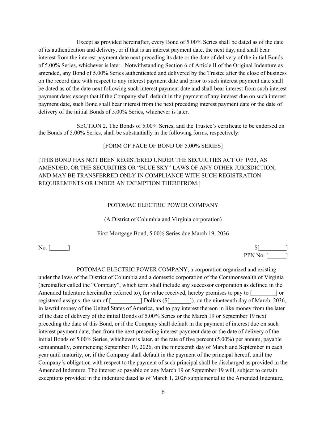 6 Except as provided hereinafter, every Bond of 5.00% Series shall be dated as of the date of its authentication and delivery, or if that is an interest payment date, the next day, and shall bear interest from the interest payment date next preceding its date or the date of delivery of the initial Bonds of 5.00% Series, whichever is later. Notwithstanding Section 6 of Article II of the Original Indenture as amended, any Bond of 5.00% Series authenticated and delivered by the Trustee after the close of business on the record date with respect to any interest payment date and prior to such interest payment date shall be dated as of the date next following such interest payment date and shall bear interest from such interest payment date; except that if the Company shall default in the payment of any interest due on such interest payment date, such Bond shall bear interest from the next preceding interest payment date or the date of delivery of the initial Bonds of 5.00% Series, whichever is later. SECTION 2. The Bonds of 5.00% Series, and the Trustee’s certificate to be endorsed on the Bonds of 5.00% Series, shall be substantially in the following forms, respectively: [FORM OF FACE OF BOND OF 5.00% SERIES] [THIS BOND HAS NOT BEEN REGISTERED UNDER THE SECURITIES ACT OF 1933, AS AMENDED, OR THE SECURITIES OR “BLUE SKY” LAWS OF ANY OTHER JURISDICTION, AND MAY BE TRANSFERRED ONLY IN COMPLIANCE WITH SUCH REGISTRATION REQUIREMENTS OR UNDER AN EXEMPTION THEREFROM.] POTOMAC ELECTRIC POWER COMPANY (A District of Columbia and Virginia corporation) First Mortgage Bond, 5.00% Series due March 19, 2036 No. [______] $[_________] PPN No. [______] POTOMAC ELECTRIC POWER COMPANY, a corporation organized and existing under the laws of the District of Columbia and a domestic corporation of the Commonwealth of Virginia (hereinafter called the “Company”, which term shall include any successor corporation as defined in the Amended Indenture hereinafter referred to), for value received, hereby promises to pay to [________] or registered assigns, the sum of [__________] Dollars ($[_______]), on the nineteenth day of March, 2036, in lawful money of the United States of America, and to pay interest thereon in like money from the later of the date of delivery of the initial Bonds of 5.00% Series or the March 19 or September 19 next preceding the date of this Bond, or if the Company shall default in the payment of interest due on such interest payment date, then from the next preceding interest payment date or the date of delivery of the initial Bonds of 5.00% Series, whichever is later, at the rate of five percent (5.00%) per annum, payable semiannually, commencing September 19, 2026, on the nineteenth day of March and September in each year until maturity, or, if the Company shall default in the payment of the principal hereof, until the Company’s obligation with respect to the payment of such principal shall be discharged as provided in the Amended Indenture. The interest so payable on any March 19 or September 19 will, subject to certain exceptions provided in the indenture dated as of March 1, 2026 supplemental to the Amended Indenture,