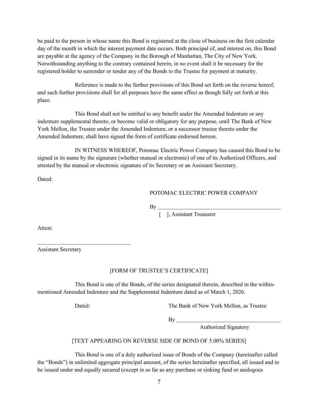 7 be paid to the person in whose name this Bond is registered at the close of business on the first calendar day of the month in which the interest payment date occurs. Both principal of, and interest on, this Bond are payable at the agency of the Company in the Borough of Manhattan, The City of New York. Notwithstanding anything to the contrary contained herein, in no event shall it be necessary for the registered holder to surrender or tender any of the Bonds to the Trustee for payment at maturity. Reference is made to the further provisions of this Bond set forth on the reverse hereof, and such further provisions shall for all purposes have the same effect as though fully set forth at this place. This Bond shall not be entitled to any benefit under the Amended Indenture or any indenture supplemental thereto, or become valid or obligatory for any purpose, until The Bank of New York Mellon, the Trustee under the Amended Indenture, or a successor trustee thereto under the Amended Indenture, shall have signed the form of certificate endorsed hereon. IN WITNESS WHEREOF, Potomac Electric Power Company has caused this Bond to be signed in its name by the signature (whether manual or electronic) of one of its Authorized Officers, and attested by the manual or electronic signature of its Secretary or an Assistant Secretary. Dated: POTOMAC ELECTRIC POWER COMPANY By [ ], Assistant Treasurer Attest: Assistant Secretary [FORM OF TRUSTEE’S CERTIFICATE] This Bond is one of the Bonds, of the series designated therein, described in the within- mentioned Amended Indenture and the Supplemental Indenture dated as of March 1, 2026. Dated: The Bank of New York Mellon, as Trustee By Authorized Signatory [TEXT APPEARING ON REVERSE SIDE OF BOND OF 5.00% SERIES] This Bond is one of a duly authorized issue of Bonds of the Company (hereinafter called the “Bonds”) in unlimited aggregate principal amount, of the series hereinafter specified, all issued and to be issued under and equally secured (except in so far as any purchase or sinking fund or analogous