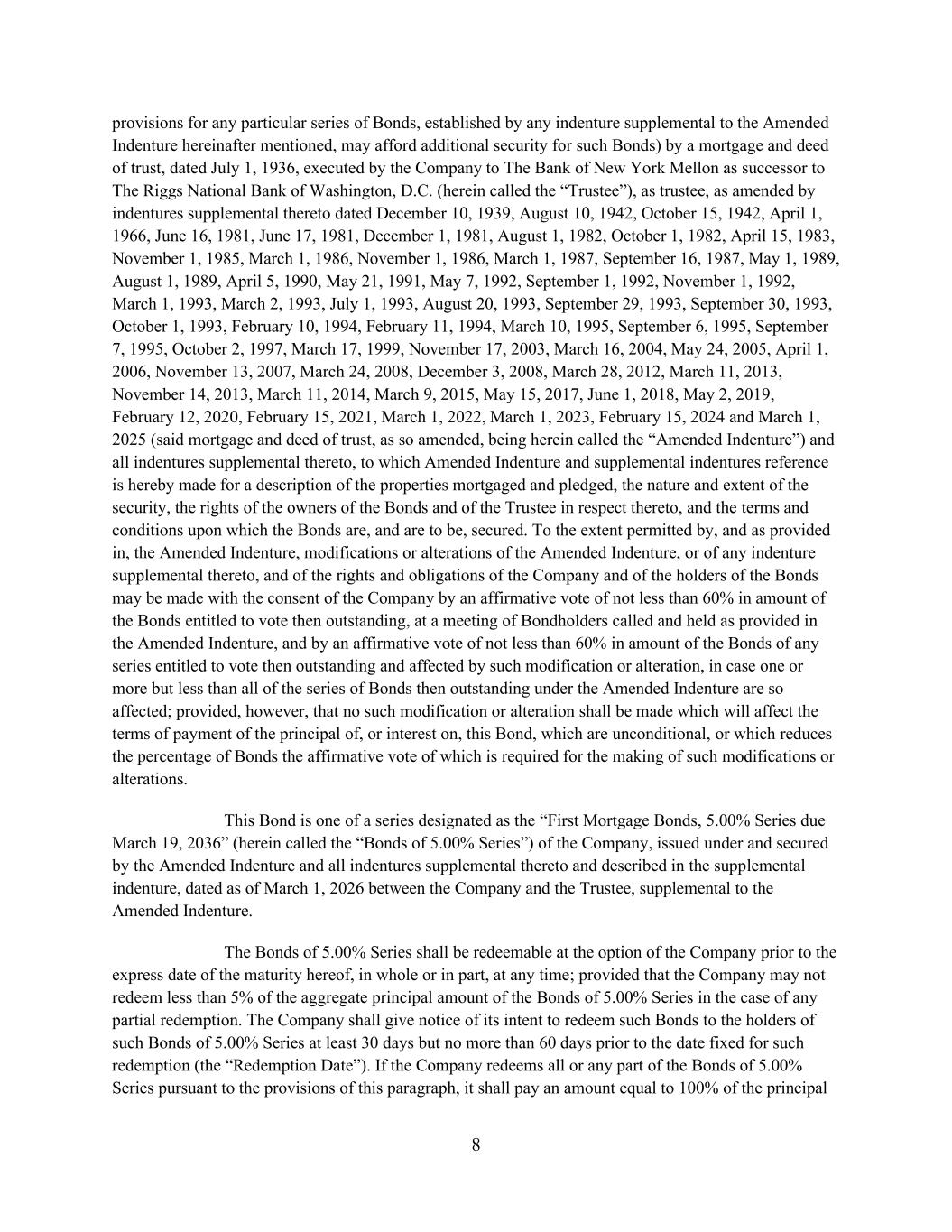 8 provisions for any particular series of Bonds, established by any indenture supplemental to the Amended Indenture hereinafter mentioned, may afford additional security for such Bonds) by a mortgage and deed of trust, dated July 1, 1936, executed by the Company to The Bank of New York Mellon as successor to The Riggs National Bank of Washington, D.C. (herein called the “Trustee”), as trustee, as amended by indentures supplemental thereto dated December 10, 1939, August 10, 1942, October 15, 1942, April 1, 1966, June 16, 1981, June 17, 1981, December 1, 1981, August 1, 1982, October 1, 1982, April 15, 1983, November 1, 1985, March 1, 1986, November 1, 1986, March 1, 1987, September 16, 1987, May 1, 1989, August 1, 1989, April 5, 1990, May 21, 1991, May 7, 1992, September 1, 1992, November 1, 1992, March 1, 1993, March 2, 1993, July 1, 1993, August 20, 1993, September 29, 1993, September 30, 1993, October 1, 1993, February 10, 1994, February 11, 1994, March 10, 1995, September 6, 1995, September 7, 1995, October 2, 1997, March 17, 1999, November 17, 2003, March 16, 2004, May 24, 2005, April 1, 2006, November 13, 2007, March 24, 2008, December 3, 2008, March 28, 2012, March 11, 2013, November 14, 2013, March 11, 2014, March 9, 2015, May 15, 2017, June 1, 2018, May 2, 2019, February 12, 2020, February 15, 2021, March 1, 2022, March 1, 2023, February 15, 2024 and March 1, 2025 (said mortgage and deed of trust, as so amended, being herein called the “Amended Indenture”) and all indentures supplemental thereto, to which Amended Indenture and supplemental indentures reference is hereby made for a description of the properties mortgaged and pledged, the nature and extent of the security, the rights of the owners of the Bonds and of the Trustee in respect thereto, and the terms and conditions upon which the Bonds are, and are to be, secured. To the extent permitted by, and as provided in, the Amended Indenture, modifications or alterations of the Amended Indenture, or of any indenture supplemental thereto, and of the rights and obligations of the Company and of the holders of the Bonds may be made with the consent of the Company by an affirmative vote of not less than 60% in amount of the Bonds entitled to vote then outstanding, at a meeting of Bondholders called and held as provided in the Amended Indenture, and by an affirmative vote of not less than 60% in amount of the Bonds of any series entitled to vote then outstanding and affected by such modification or alteration, in case one or more but less than all of the series of Bonds then outstanding under the Amended Indenture are so affected; provided, however, that no such modification or alteration shall be made which will affect the terms of payment of the principal of, or interest on, this Bond, which are unconditional, or which reduces the percentage of Bonds the affirmative vote of which is required for the making of such modifications or alterations. This Bond is one of a series designated as the “First Mortgage Bonds, 5.00% Series due March 19, 2036” (herein called the “Bonds of 5.00% Series”) of the Company, issued under and secured by the Amended Indenture and all indentures supplemental thereto and described in the supplemental indenture, dated as of March 1, 2026 between the Company and the Trustee, supplemental to the Amended Indenture. The Bonds of 5.00% Series shall be redeemable at the option of the Company prior to the express date of the maturity hereof, in whole or in part, at any time; provided that the Company may not redeem less than 5% of the aggregate principal amount of the Bonds of 5.00% Series in the case of any partial redemption. The Company shall give notice of its intent to redeem such Bonds to the holders of such Bonds of 5.00% Series at least 30 days but no more than 60 days prior to the date fixed for such redemption (the “Redemption Date”). If the Company redeems all or any part of the Bonds of 5.00% Series pursuant to the provisions of this paragraph, it shall pay an amount equal to 100% of the principal