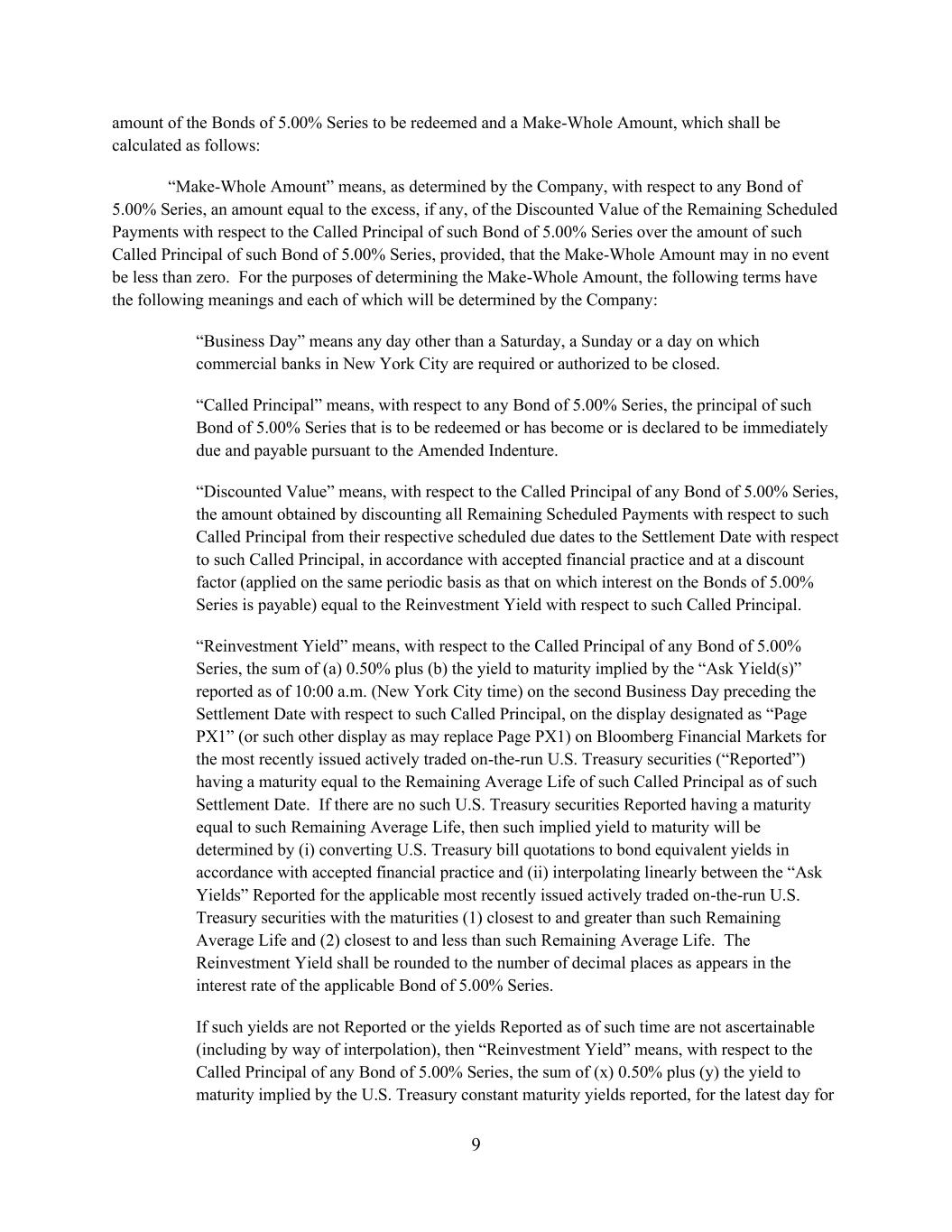 9 amount of the Bonds of 5.00% Series to be redeemed and a Make-Whole Amount, which shall be calculated as follows: “Make-Whole Amount” means, as determined by the Company, with respect to any Bond of 5.00% Series, an amount equal to the excess, if any, of the Discounted Value of the Remaining Scheduled Payments with respect to the Called Principal of such Bond of 5.00% Series over the amount of such Called Principal of such Bond of 5.00% Series, provided, that the Make-Whole Amount may in no event be less than zero. For the purposes of determining the Make-Whole Amount, the following terms have the following meanings and each of which will be determined by the Company: “Business Day” means any day other than a Saturday, a Sunday or a day on which commercial banks in New York City are required or authorized to be closed. “Called Principal” means, with respect to any Bond of 5.00% Series, the principal of such Bond of 5.00% Series that is to be redeemed or has become or is declared to be immediately due and payable pursuant to the Amended Indenture. “Discounted Value” means, with respect to the Called Principal of any Bond of 5.00% Series, the amount obtained by discounting all Remaining Scheduled Payments with respect to such Called Principal from their respective scheduled due dates to the Settlement Date with respect to such Called Principal, in accordance with accepted financial practice and at a discount factor (applied on the same periodic basis as that on which interest on the Bonds of 5.00% Series is payable) equal to the Reinvestment Yield with respect to such Called Principal. “Reinvestment Yield” means, with respect to the Called Principal of any Bond of 5.00% Series, the sum of (a) 0.50% plus (b) the yield to maturity implied by the “Ask Yield(s)” reported as of 10:00 a.m. (New York City time) on the second Business Day preceding the Settlement Date with respect to such Called Principal, on the display designated as “Page PX1” (or such other display as may replace Page PX1) on Bloomberg Financial Markets for the most recently issued actively traded on-the-run U.S. Treasury securities (“Reported”) having a maturity equal to the Remaining Average Life of such Called Principal as of such Settlement Date. If there are no such U.S. Treasury securities Reported having a maturity equal to such Remaining Average Life, then such implied yield to maturity will be determined by (i) converting U.S. Treasury bill quotations to bond equivalent yields in accordance with accepted financial practice and (ii) interpolating linearly between the “Ask Yields” Reported for the applicable most recently issued actively traded on-the-run U.S. Treasury securities with the maturities (1) closest to and greater than such Remaining Average Life and (2) closest to and less than such Remaining Average Life. The Reinvestment Yield shall be rounded to the number of decimal places as appears in the interest rate of the applicable Bond of 5.00% Series. If such yields are not Reported or the yields Reported as of such time are not ascertainable (including by way of interpolation), then “Reinvestment Yield” means, with respect to the Called Principal of any Bond of 5.00% Series, the sum of (x) 0.50% plus (y) the yield to maturity implied by the U.S. Treasury constant maturity yields reported, for the latest day for