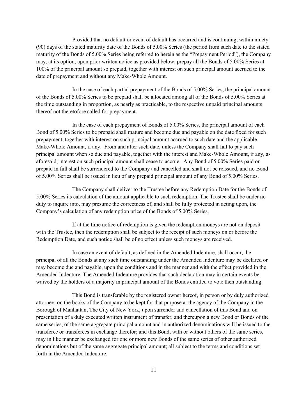 11 Provided that no default or event of default has occurred and is continuing, within ninety (90) days of the stated maturity date of the Bonds of 5.00% Series (the period from such date to the stated maturity of the Bonds of 5.00% Series being referred to herein as the “Prepayment Period”), the Company may, at its option, upon prior written notice as provided below, prepay all the Bonds of 5.00% Series at 100% of the principal amount so prepaid, together with interest on such principal amount accrued to the date of prepayment and without any Make-Whole Amount. In the case of each partial prepayment of the Bonds of 5.00% Series, the principal amount of the Bonds of 5.00% Series to be prepaid shall be allocated among all of the Bonds of 5.00% Series at the time outstanding in proportion, as nearly as practicable, to the respective unpaid principal amounts thereof not theretofore called for prepayment. In the case of each prepayment of Bonds of 5.00% Series, the principal amount of each Bond of 5.00% Series to be prepaid shall mature and become due and payable on the date fixed for such prepayment, together with interest on such principal amount accrued to such date and the applicable Make-Whole Amount, if any. From and after such date, unless the Company shall fail to pay such principal amount when so due and payable, together with the interest and Make-Whole Amount, if any, as aforesaid, interest on such principal amount shall cease to accrue. Any Bond of 5.00% Series paid or prepaid in full shall be surrendered to the Company and cancelled and shall not be reissued, and no Bond of 5.00% Series shall be issued in lieu of any prepaid principal amount of any Bond of 5.00% Series. The Company shall deliver to the Trustee before any Redemption Date for the Bonds of 5.00% Series its calculation of the amount applicable to such redemption. The Trustee shall be under no duty to inquire into, may presume the correctness of, and shall be fully protected in acting upon, the Company’s calculation of any redemption price of the Bonds of 5.00% Series. If at the time notice of redemption is given the redemption moneys are not on deposit with the Trustee, then the redemption shall be subject to the receipt of such moneys on or before the Redemption Date, and such notice shall be of no effect unless such moneys are received. In case an event of default, as defined in the Amended Indenture, shall occur, the principal of all the Bonds at any such time outstanding under the Amended Indenture may be declared or may become due and payable, upon the conditions and in the manner and with the effect provided in the Amended Indenture. The Amended Indenture provides that such declaration may in certain events be waived by the holders of a majority in principal amount of the Bonds entitled to vote then outstanding. This Bond is transferable by the registered owner hereof, in person or by duly authorized attorney, on the books of the Company to be kept for that purpose at the agency of the Company in the Borough of Manhattan, The City of New York, upon surrender and cancellation of this Bond and on presentation of a duly executed written instrument of transfer, and thereupon a new Bond or Bonds of the same series, of the same aggregate principal amount and in authorized denominations will be issued to the transferee or transferees in exchange therefor; and this Bond, with or without others of the same series, may in like manner be exchanged for one or more new Bonds of the same series of other authorized denominations but of the same aggregate principal amount; all subject to the terms and conditions set forth in the Amended Indenture.