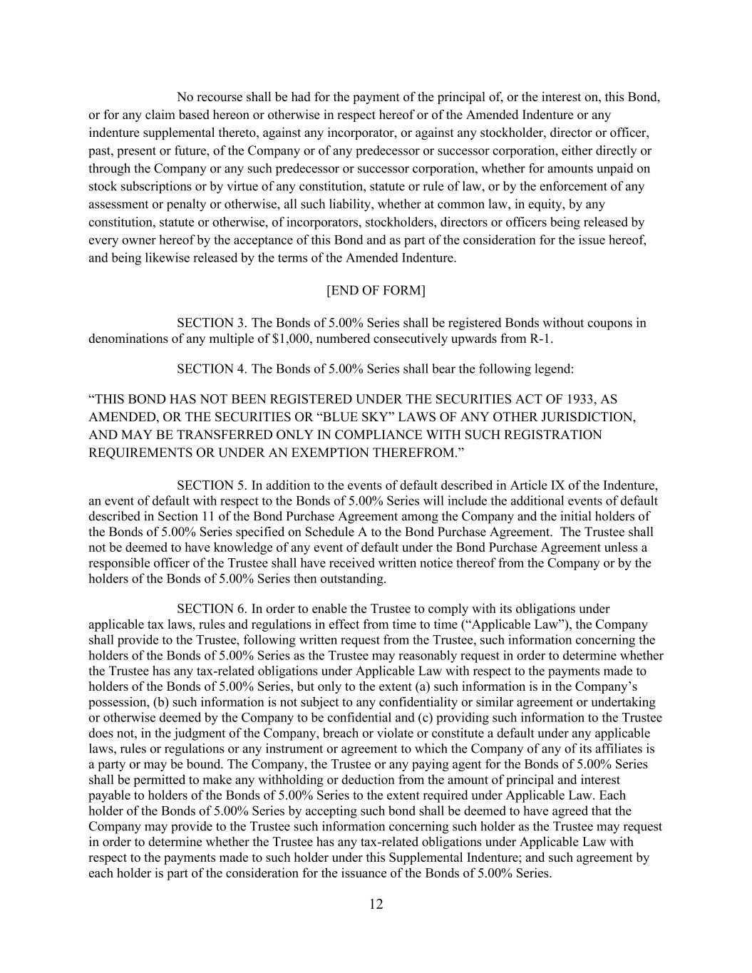 12 No recourse shall be had for the payment of the principal of, or the interest on, this Bond, or for any claim based hereon or otherwise in respect hereof or of the Amended Indenture or any indenture supplemental thereto, against any incorporator, or against any stockholder, director or officer, past, present or future, of the Company or of any predecessor or successor corporation, either directly or through the Company or any such predecessor or successor corporation, whether for amounts unpaid on stock subscriptions or by virtue of any constitution, statute or rule of law, or by the enforcement of any assessment or penalty or otherwise, all such liability, whether at common law, in equity, by any constitution, statute or otherwise, of incorporators, stockholders, directors or officers being released by every owner hereof by the acceptance of this Bond and as part of the consideration for the issue hereof, and being likewise released by the terms of the Amended Indenture. [END OF FORM] SECTION 3. The Bonds of 5.00% Series shall be registered Bonds without coupons in denominations of any multiple of $1,000, numbered consecutively upwards from R-1. SECTION 4. The Bonds of 5.00% Series shall bear the following legend: “THIS BOND HAS NOT BEEN REGISTERED UNDER THE SECURITIES ACT OF 1933, AS AMENDED, OR THE SECURITIES OR “BLUE SKY” LAWS OF ANY OTHER JURISDICTION, AND MAY BE TRANSFERRED ONLY IN COMPLIANCE WITH SUCH REGISTRATION REQUIREMENTS OR UNDER AN EXEMPTION THEREFROM.” SECTION 5. In addition to the events of default described in Article IX of the Indenture, an event of default with respect to the Bonds of 5.00% Series will include the additional events of default described in Section 11 of the Bond Purchase Agreement among the Company and the initial holders of the Bonds of 5.00% Series specified on Schedule A to the Bond Purchase Agreement. The Trustee shall not be deemed to have knowledge of any event of default under the Bond Purchase Agreement unless a responsible officer of the Trustee shall have received written notice thereof from the Company or by the holders of the Bonds of 5.00% Series then outstanding. SECTION 6. In order to enable the Trustee to comply with its obligations under applicable tax laws, rules and regulations in effect from time to time (“Applicable Law”), the Company shall provide to the Trustee, following written request from the Trustee, such information concerning the holders of the Bonds of 5.00% Series as the Trustee may reasonably request in order to determine whether the Trustee has any tax-related obligations under Applicable Law with respect to the payments made to holders of the Bonds of 5.00% Series, but only to the extent (a) such information is in the Company’s possession, (b) such information is not subject to any confidentiality or similar agreement or undertaking or otherwise deemed by the Company to be confidential and (c) providing such information to the Trustee does not, in the judgment of the Company, breach or violate or constitute a default under any applicable laws, rules or regulations or any instrument or agreement to which the Company of any of its affiliates is a party or may be bound. The Company, the Trustee or any paying agent for the Bonds of 5.00% Series shall be permitted to make any withholding or deduction from the amount of principal and interest payable to holders of the Bonds of 5.00% Series to the extent required under Applicable Law. Each holder of the Bonds of 5.00% Series by accepting such bond shall be deemed to have agreed that the Company may provide to the Trustee such information concerning such holder as the Trustee may request in order to determine whether the Trustee has any tax-related obligations under Applicable Law with respect to the payments made to such holder under this Supplemental Indenture; and such agreement by each holder is part of the consideration for the issuance of the Bonds of 5.00% Series.