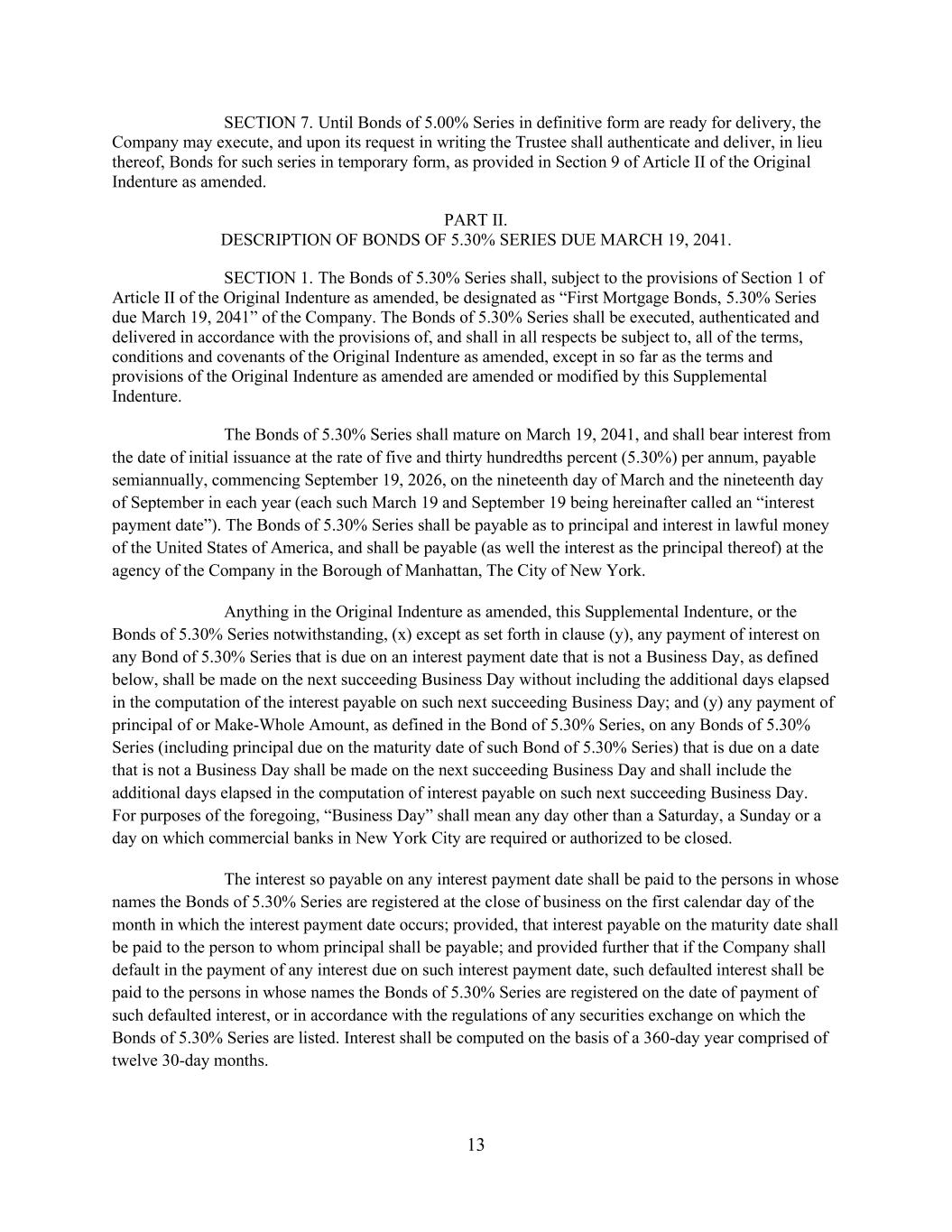 13 SECTION 7. Until Bonds of 5.00% Series in definitive form are ready for delivery, the Company may execute, and upon its request in writing the Trustee shall authenticate and deliver, in lieu thereof, Bonds for such series in temporary form, as provided in Section 9 of Article II of the Original Indenture as amended. PART II. DESCRIPTION OF BONDS OF 5.30% SERIES DUE MARCH 19, 2041. SECTION 1. The Bonds of 5.30% Series shall, subject to the provisions of Section 1 of Article II of the Original Indenture as amended, be designated as “First Mortgage Bonds, 5.30% Series due March 19, 2041” of the Company. The Bonds of 5.30% Series shall be executed, authenticated and delivered in accordance with the provisions of, and shall in all respects be subject to, all of the terms, conditions and covenants of the Original Indenture as amended, except in so far as the terms and provisions of the Original Indenture as amended are amended or modified by this Supplemental Indenture. The Bonds of 5.30% Series shall mature on March 19, 2041, and shall bear interest from the date of initial issuance at the rate of five and thirty hundredths percent (5.30%) per annum, payable semiannually, commencing September 19, 2026, on the nineteenth day of March and the nineteenth day of September in each year (each such March 19 and September 19 being hereinafter called an “interest payment date”). The Bonds of 5.30% Series shall be payable as to principal and interest in lawful money of the United States of America, and shall be payable (as well the interest as the principal thereof) at the agency of the Company in the Borough of Manhattan, The City of New York. Anything in the Original Indenture as amended, this Supplemental Indenture, or the Bonds of 5.30% Series notwithstanding, (x) except as set forth in clause (y), any payment of interest on any Bond of 5.30% Series that is due on an interest payment date that is not a Business Day, as defined below, shall be made on the next succeeding Business Day without including the additional days elapsed in the computation of the interest payable on such next succeeding Business Day; and (y) any payment of principal of or Make-Whole Amount, as defined in the Bond of 5.30% Series, on any Bonds of 5.30% Series (including principal due on the maturity date of such Bond of 5.30% Series) that is due on a date that is not a Business Day shall be made on the next succeeding Business Day and shall include the additional days elapsed in the computation of interest payable on such next succeeding Business Day. For purposes of the foregoing, “Business Day” shall mean any day other than a Saturday, a Sunday or a day on which commercial banks in New York City are required or authorized to be closed. The interest so payable on any interest payment date shall be paid to the persons in whose names the Bonds of 5.30% Series are registered at the close of business on the first calendar day of the month in which the interest payment date occurs; provided, that interest payable on the maturity date shall be paid to the person to whom principal shall be payable; and provided further that if the Company shall default in the payment of any interest due on such interest payment date, such defaulted interest shall be paid to the persons in whose names the Bonds of 5.30% Series are registered on the date of payment of such defaulted interest, or in accordance with the regulations of any securities exchange on which the Bonds of 5.30% Series are listed. Interest shall be computed on the basis of a 360-day year comprised of twelve 30-day months.