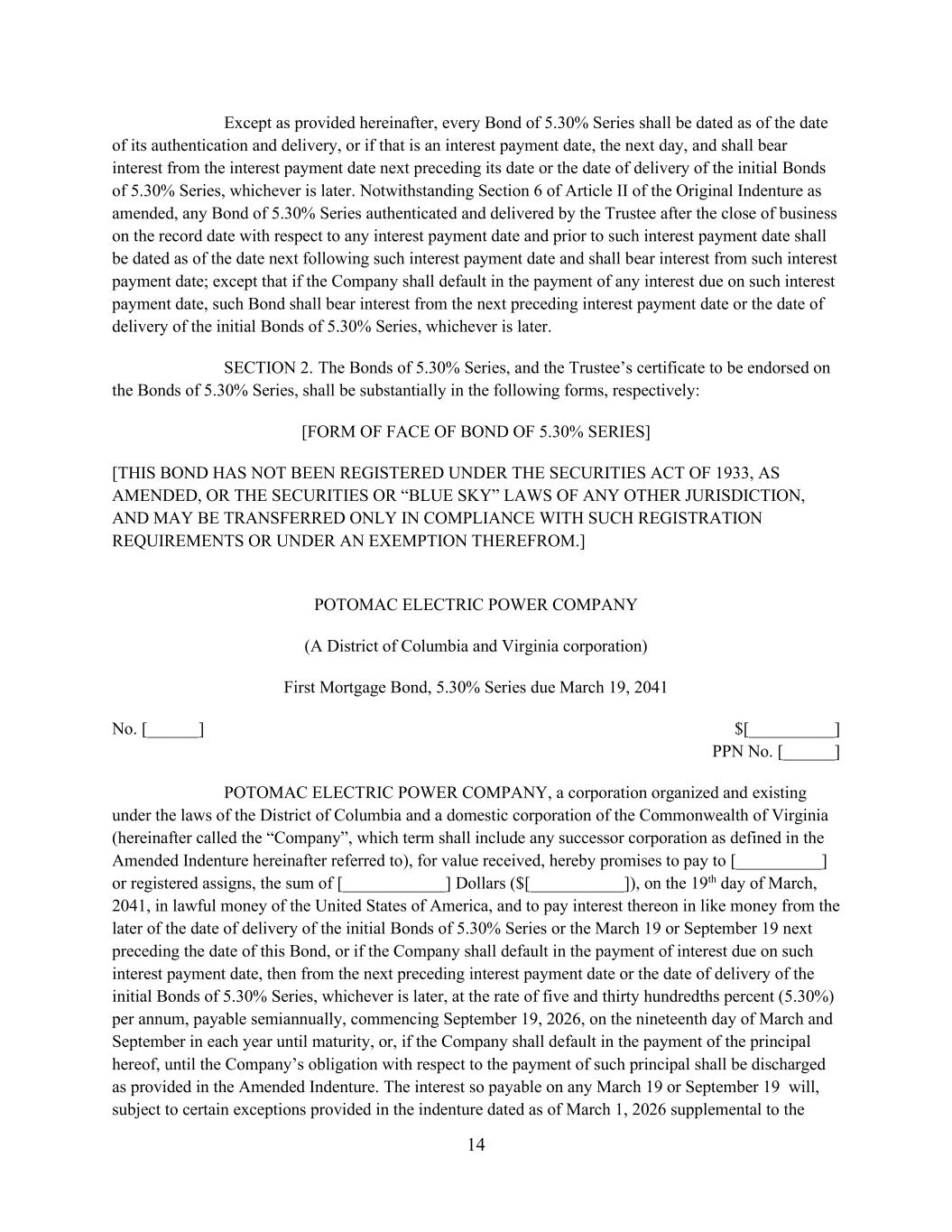 14 Except as provided hereinafter, every Bond of 5.30% Series shall be dated as of the date of its authentication and delivery, or if that is an interest payment date, the next day, and shall bear interest from the interest payment date next preceding its date or the date of delivery of the initial Bonds of 5.30% Series, whichever is later. Notwithstanding Section 6 of Article II of the Original Indenture as amended, any Bond of 5.30% Series authenticated and delivered by the Trustee after the close of business on the record date with respect to any interest payment date and prior to such interest payment date shall be dated as of the date next following such interest payment date and shall bear interest from such interest payment date; except that if the Company shall default in the payment of any interest due on such interest payment date, such Bond shall bear interest from the next preceding interest payment date or the date of delivery of the initial Bonds of 5.30% Series, whichever is later. SECTION 2. The Bonds of 5.30% Series, and the Trustee’s certificate to be endorsed on the Bonds of 5.30% Series, shall be substantially in the following forms, respectively: [FORM OF FACE OF BOND OF 5.30% SERIES] [THIS BOND HAS NOT BEEN REGISTERED UNDER THE SECURITIES ACT OF 1933, AS AMENDED, OR THE SECURITIES OR “BLUE SKY” LAWS OF ANY OTHER JURISDICTION, AND MAY BE TRANSFERRED ONLY IN COMPLIANCE WITH SUCH REGISTRATION REQUIREMENTS OR UNDER AN EXEMPTION THEREFROM.] POTOMAC ELECTRIC POWER COMPANY (A District of Columbia and Virginia corporation) First Mortgage Bond, 5.30% Series due March 19, 2041 No. [______] $[__________] PPN No. [______] POTOMAC ELECTRIC POWER COMPANY, a corporation organized and existing under the laws of the District of Columbia and a domestic corporation of the Commonwealth of Virginia (hereinafter called the “Company”, which term shall include any successor corporation as defined in the Amended Indenture hereinafter referred to), for value received, hereby promises to pay to [__________] or registered assigns, the sum of [____________] Dollars ($[___________]), on the 19th day of March, 2041, in lawful money of the United States of America, and to pay interest thereon in like money from the later of the date of delivery of the initial Bonds of 5.30% Series or the March 19 or September 19 next preceding the date of this Bond, or if the Company shall default in the payment of interest due on such interest payment date, then from the next preceding interest payment date or the date of delivery of the initial Bonds of 5.30% Series, whichever is later, at the rate of five and thirty hundredths percent (5.30%) per annum, payable semiannually, commencing September 19, 2026, on the nineteenth day of March and September in each year until maturity, or, if the Company shall default in the payment of the principal hereof, until the Company’s obligation with respect to the payment of such principal shall be discharged as provided in the Amended Indenture. The interest so payable on any March 19 or September 19 will, subject to certain exceptions provided in the indenture dated as of March 1, 2026 supplemental to the