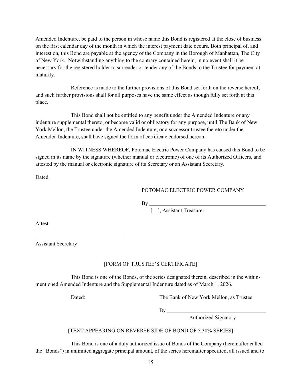 15 Amended Indenture, be paid to the person in whose name this Bond is registered at the close of business on the first calendar day of the month in which the interest payment date occurs. Both principal of, and interest on, this Bond are payable at the agency of the Company in the Borough of Manhattan, The City of New York. Notwithstanding anything to the contrary contained herein, in no event shall it be necessary for the registered holder to surrender or tender any of the Bonds to the Trustee for payment at maturity. Reference is made to the further provisions of this Bond set forth on the reverse hereof, and such further provisions shall for all purposes have the same effect as though fully set forth at this place. This Bond shall not be entitled to any benefit under the Amended Indenture or any indenture supplemental thereto, or become valid or obligatory for any purpose, until The Bank of New York Mellon, the Trustee under the Amended Indenture, or a successor trustee thereto under the Amended Indenture, shall have signed the form of certificate endorsed hereon. IN WITNESS WHEREOF, Potomac Electric Power Company has caused this Bond to be signed in its name by the signature (whether manual or electronic) of one of its Authorized Officers, and attested by the manual or electronic signature of its Secretary or an Assistant Secretary. Dated: POTOMAC ELECTRIC POWER COMPANY By [ ], Assistant Treasurer Attest: Assistant Secretary [FORM OF TRUSTEE’S CERTIFICATE] This Bond is one of the Bonds, of the series designated therein, described in the within- mentioned Amended Indenture and the Supplemental Indenture dated as of March 1, 2026. Dated: The Bank of New York Mellon, as Trustee By Authorized Signatory [TEXT APPEARING ON REVERSE SIDE OF BOND OF 5.30% SERIES] This Bond is one of a duly authorized issue of Bonds of the Company (hereinafter called the “Bonds”) in unlimited aggregate principal amount, of the series hereinafter specified, all issued and to