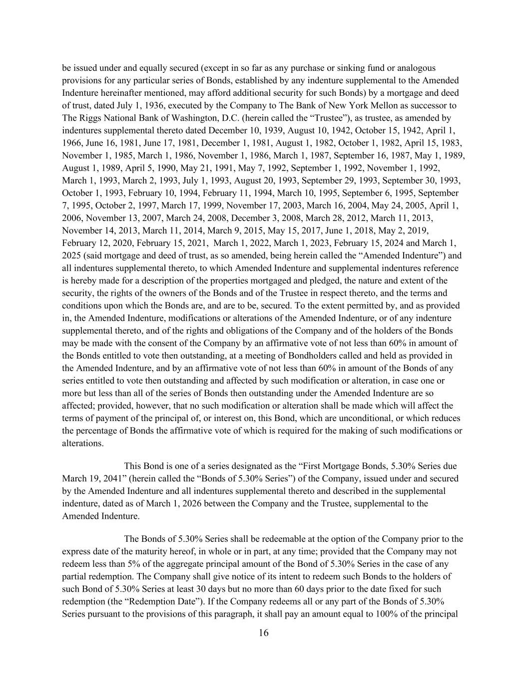 16 be issued under and equally secured (except in so far as any purchase or sinking fund or analogous provisions for any particular series of Bonds, established by any indenture supplemental to the Amended Indenture hereinafter mentioned, may afford additional security for such Bonds) by a mortgage and deed of trust, dated July 1, 1936, executed by the Company to The Bank of New York Mellon as successor to The Riggs National Bank of Washington, D.C. (herein called the “Trustee”), as trustee, as amended by indentures supplemental thereto dated December 10, 1939, August 10, 1942, October 15, 1942, April 1, 1966, June 16, 1981, June 17, 1981, December 1, 1981, August 1, 1982, October 1, 1982, April 15, 1983, November 1, 1985, March 1, 1986, November 1, 1986, March 1, 1987, September 16, 1987, May 1, 1989, August 1, 1989, April 5, 1990, May 21, 1991, May 7, 1992, September 1, 1992, November 1, 1992, March 1, 1993, March 2, 1993, July 1, 1993, August 20, 1993, September 29, 1993, September 30, 1993, October 1, 1993, February 10, 1994, February 11, 1994, March 10, 1995, September 6, 1995, September 7, 1995, October 2, 1997, March 17, 1999, November 17, 2003, March 16, 2004, May 24, 2005, April 1, 2006, November 13, 2007, March 24, 2008, December 3, 2008, March 28, 2012, March 11, 2013, November 14, 2013, March 11, 2014, March 9, 2015, May 15, 2017, June 1, 2018, May 2, 2019, February 12, 2020, February 15, 2021, March 1, 2022, March 1, 2023, February 15, 2024 and March 1, 2025 (said mortgage and deed of trust, as so amended, being herein called the “Amended Indenture”) and all indentures supplemental thereto, to which Amended Indenture and supplemental indentures reference is hereby made for a description of the properties mortgaged and pledged, the nature and extent of the security, the rights of the owners of the Bonds and of the Trustee in respect thereto, and the terms and conditions upon which the Bonds are, and are to be, secured. To the extent permitted by, and as provided in, the Amended Indenture, modifications or alterations of the Amended Indenture, or of any indenture supplemental thereto, and of the rights and obligations of the Company and of the holders of the Bonds may be made with the consent of the Company by an affirmative vote of not less than 60% in amount of the Bonds entitled to vote then outstanding, at a meeting of Bondholders called and held as provided in the Amended Indenture, and by an affirmative vote of not less than 60% in amount of the Bonds of any series entitled to vote then outstanding and affected by such modification or alteration, in case one or more but less than all of the series of Bonds then outstanding under the Amended Indenture are so affected; provided, however, that no such modification or alteration shall be made which will affect the terms of payment of the principal of, or interest on, this Bond, which are unconditional, or which reduces the percentage of Bonds the affirmative vote of which is required for the making of such modifications or alterations. This Bond is one of a series designated as the “First Mortgage Bonds, 5.30% Series due March 19, 2041” (herein called the “Bonds of 5.30% Series”) of the Company, issued under and secured by the Amended Indenture and all indentures supplemental thereto and described in the supplemental indenture, dated as of March 1, 2026 between the Company and the Trustee, supplemental to the Amended Indenture. The Bonds of 5.30% Series shall be redeemable at the option of the Company prior to the express date of the maturity hereof, in whole or in part, at any time; provided that the Company may not redeem less than 5% of the aggregate principal amount of the Bond of 5.30% Series in the case of any partial redemption. The Company shall give notice of its intent to redeem such Bonds to the holders of such Bond of 5.30% Series at least 30 days but no more than 60 days prior to the date fixed for such redemption (the “Redemption Date”). If the Company redeems all or any part of the Bonds of 5.30% Series pursuant to the provisions of this paragraph, it shall pay an amount equal to 100% of the principal