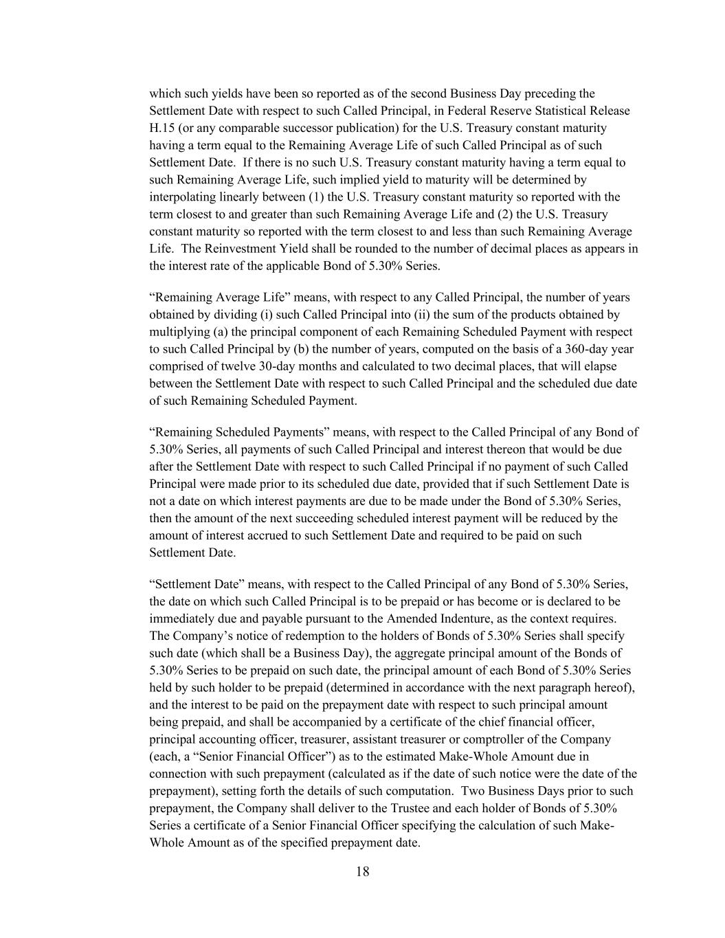 18 which such yields have been so reported as of the second Business Day preceding the Settlement Date with respect to such Called Principal, in Federal Reserve Statistical Release H.15 (or any comparable successor publication) for the U.S. Treasury constant maturity having a term equal to the Remaining Average Life of such Called Principal as of such Settlement Date. If there is no such U.S. Treasury constant maturity having a term equal to such Remaining Average Life, such implied yield to maturity will be determined by interpolating linearly between (1) the U.S. Treasury constant maturity so reported with the term closest to and greater than such Remaining Average Life and (2) the U.S. Treasury constant maturity so reported with the term closest to and less than such Remaining Average Life. The Reinvestment Yield shall be rounded to the number of decimal places as appears in the interest rate of the applicable Bond of 5.30% Series. “Remaining Average Life” means, with respect to any Called Principal, the number of years obtained by dividing (i) such Called Principal into (ii) the sum of the products obtained by multiplying (a) the principal component of each Remaining Scheduled Payment with respect to such Called Principal by (b) the number of years, computed on the basis of a 360-day year comprised of twelve 30-day months and calculated to two decimal places, that will elapse between the Settlement Date with respect to such Called Principal and the scheduled due date of such Remaining Scheduled Payment. “Remaining Scheduled Payments” means, with respect to the Called Principal of any Bond of 5.30% Series, all payments of such Called Principal and interest thereon that would be due after the Settlement Date with respect to such Called Principal if no payment of such Called Principal were made prior to its scheduled due date, provided that if such Settlement Date is not a date on which interest payments are due to be made under the Bond of 5.30% Series, then the amount of the next succeeding scheduled interest payment will be reduced by the amount of interest accrued to such Settlement Date and required to be paid on such Settlement Date. “Settlement Date” means, with respect to the Called Principal of any Bond of 5.30% Series, the date on which such Called Principal is to be prepaid or has become or is declared to be immediately due and payable pursuant to the Amended Indenture, as the context requires. The Company’s notice of redemption to the holders of Bonds of 5.30% Series shall specify such date (which shall be a Business Day), the aggregate principal amount of the Bonds of 5.30% Series to be prepaid on such date, the principal amount of each Bond of 5.30% Series held by such holder to be prepaid (determined in accordance with the next paragraph hereof), and the interest to be paid on the prepayment date with respect to such principal amount being prepaid, and shall be accompanied by a certificate of the chief financial officer, principal accounting officer, treasurer, assistant treasurer or comptroller of the Company (each, a “Senior Financial Officer”) as to the estimated Make-Whole Amount due in connection with such prepayment (calculated as if the date of such notice were the date of the prepayment), setting forth the details of such computation. Two Business Days prior to such prepayment, the Company shall deliver to the Trustee and each holder of Bonds of 5.30% Series a certificate of a Senior Financial Officer specifying the calculation of such Make- Whole Amount as of the specified prepayment date.