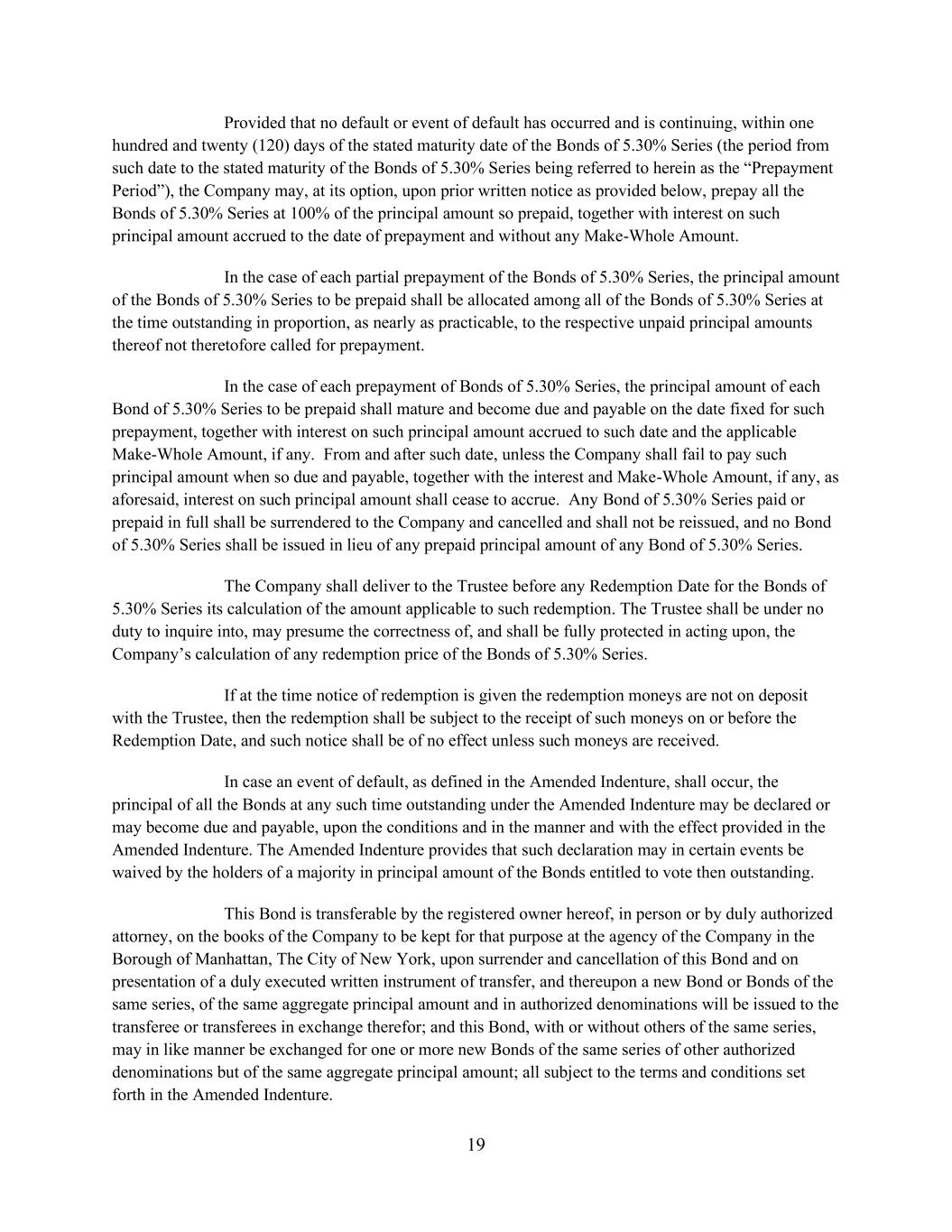 19 Provided that no default or event of default has occurred and is continuing, within one hundred and twenty (120) days of the stated maturity date of the Bonds of 5.30% Series (the period from such date to the stated maturity of the Bonds of 5.30% Series being referred to herein as the “Prepayment Period”), the Company may, at its option, upon prior written notice as provided below, prepay all the Bonds of 5.30% Series at 100% of the principal amount so prepaid, together with interest on such principal amount accrued to the date of prepayment and without any Make-Whole Amount. In the case of each partial prepayment of the Bonds of 5.30% Series, the principal amount of the Bonds of 5.30% Series to be prepaid shall be allocated among all of the Bonds of 5.30% Series at the time outstanding in proportion, as nearly as practicable, to the respective unpaid principal amounts thereof not theretofore called for prepayment. In the case of each prepayment of Bonds of 5.30% Series, the principal amount of each Bond of 5.30% Series to be prepaid shall mature and become due and payable on the date fixed for such prepayment, together with interest on such principal amount accrued to such date and the applicable Make-Whole Amount, if any. From and after such date, unless the Company shall fail to pay such principal amount when so due and payable, together with the interest and Make-Whole Amount, if any, as aforesaid, interest on such principal amount shall cease to accrue. Any Bond of 5.30% Series paid or prepaid in full shall be surrendered to the Company and cancelled and shall not be reissued, and no Bond of 5.30% Series shall be issued in lieu of any prepaid principal amount of any Bond of 5.30% Series. The Company shall deliver to the Trustee before any Redemption Date for the Bonds of 5.30% Series its calculation of the amount applicable to such redemption. The Trustee shall be under no duty to inquire into, may presume the correctness of, and shall be fully protected in acting upon, the Company’s calculation of any redemption price of the Bonds of 5.30% Series. If at the time notice of redemption is given the redemption moneys are not on deposit with the Trustee, then the redemption shall be subject to the receipt of such moneys on or before the Redemption Date, and such notice shall be of no effect unless such moneys are received. In case an event of default, as defined in the Amended Indenture, shall occur, the principal of all the Bonds at any such time outstanding under the Amended Indenture may be declared or may become due and payable, upon the conditions and in the manner and with the effect provided in the Amended Indenture. The Amended Indenture provides that such declaration may in certain events be waived by the holders of a majority in principal amount of the Bonds entitled to vote then outstanding. This Bond is transferable by the registered owner hereof, in person or by duly authorized attorney, on the books of the Company to be kept for that purpose at the agency of the Company in the Borough of Manhattan, The City of New York, upon surrender and cancellation of this Bond and on presentation of a duly executed written instrument of transfer, and thereupon a new Bond or Bonds of the same series, of the same aggregate principal amount and in authorized denominations will be issued to the transferee or transferees in exchange therefor; and this Bond, with or without others of the same series, may in like manner be exchanged for one or more new Bonds of the same series of other authorized denominations but of the same aggregate principal amount; all subject to the terms and conditions set forth in the Amended Indenture.