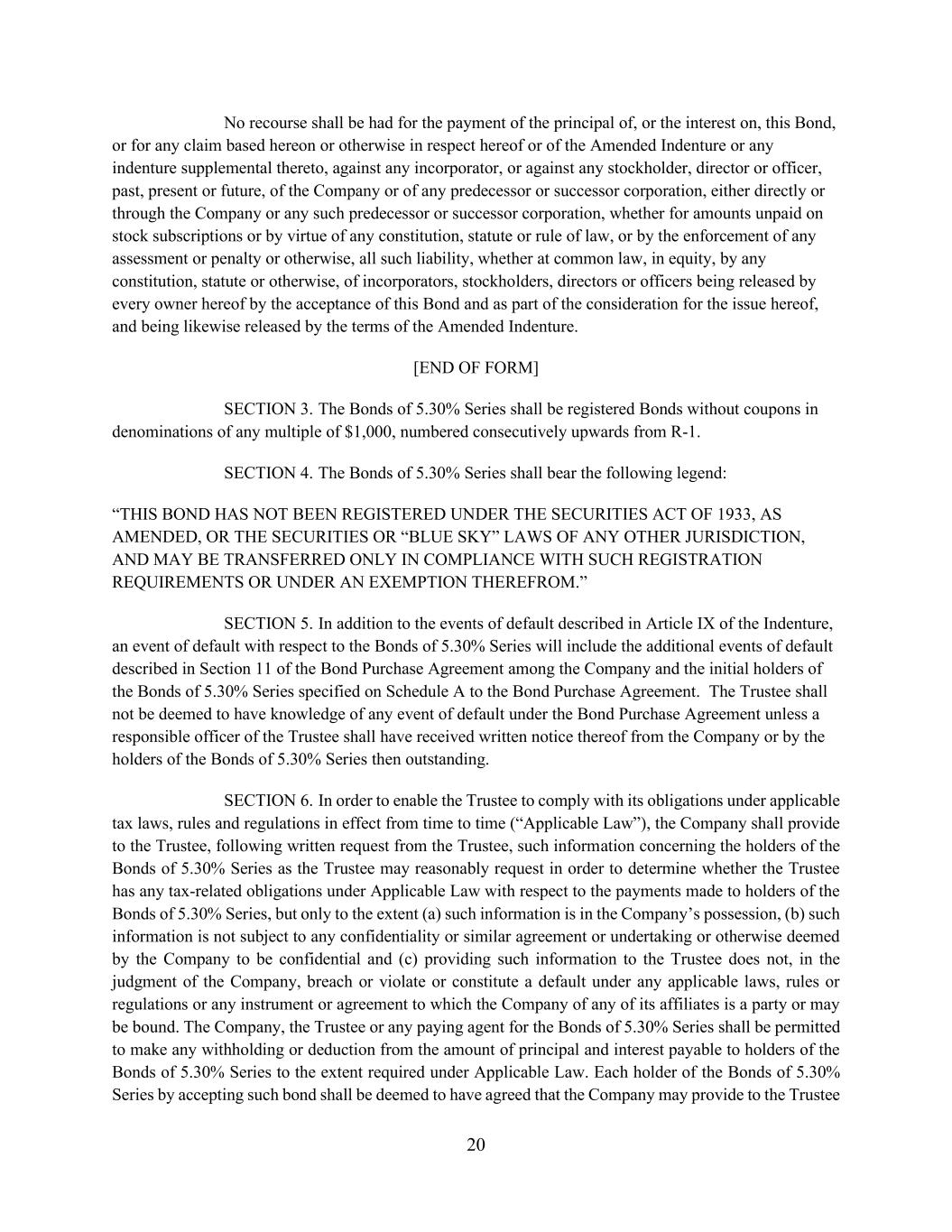 20 No recourse shall be had for the payment of the principal of, or the interest on, this Bond, or for any claim based hereon or otherwise in respect hereof or of the Amended Indenture or any indenture supplemental thereto, against any incorporator, or against any stockholder, director or officer, past, present or future, of the Company or of any predecessor or successor corporation, either directly or through the Company or any such predecessor or successor corporation, whether for amounts unpaid on stock subscriptions or by virtue of any constitution, statute or rule of law, or by the enforcement of any assessment or penalty or otherwise, all such liability, whether at common law, in equity, by any constitution, statute or otherwise, of incorporators, stockholders, directors or officers being released by every owner hereof by the acceptance of this Bond and as part of the consideration for the issue hereof, and being likewise released by the terms of the Amended Indenture. [END OF FORM] SECTION 3. The Bonds of 5.30% Series shall be registered Bonds without coupons in denominations of any multiple of $1,000, numbered consecutively upwards from R-1. SECTION 4. The Bonds of 5.30% Series shall bear the following legend: “THIS BOND HAS NOT BEEN REGISTERED UNDER THE SECURITIES ACT OF 1933, AS AMENDED, OR THE SECURITIES OR “BLUE SKY” LAWS OF ANY OTHER JURISDICTION, AND MAY BE TRANSFERRED ONLY IN COMPLIANCE WITH SUCH REGISTRATION REQUIREMENTS OR UNDER AN EXEMPTION THEREFROM.” SECTION 5. In addition to the events of default described in Article IX of the Indenture, an event of default with respect to the Bonds of 5.30% Series will include the additional events of default described in Section 11 of the Bond Purchase Agreement among the Company and the initial holders of the Bonds of 5.30% Series specified on Schedule A to the Bond Purchase Agreement. The Trustee shall not be deemed to have knowledge of any event of default under the Bond Purchase Agreement unless a responsible officer of the Trustee shall have received written notice thereof from the Company or by the holders of the Bonds of 5.30% Series then outstanding. SECTION 6. In order to enable the Trustee to comply with its obligations under applicable tax laws, rules and regulations in effect from time to time (“Applicable Law”), the Company shall provide to the Trustee, following written request from the Trustee, such information concerning the holders of the Bonds of 5.30% Series as the Trustee may reasonably request in order to determine whether the Trustee has any tax-related obligations under Applicable Law with respect to the payments made to holders of the Bonds of 5.30% Series, but only to the extent (a) such information is in the Company’s possession, (b) such information is not subject to any confidentiality or similar agreement or undertaking or otherwise deemed by the Company to be confidential and (c) providing such information to the Trustee does not, in the judgment of the Company, breach or violate or constitute a default under any applicable laws, rules or regulations or any instrument or agreement to which the Company of any of its affiliates is a party or may be bound. The Company, the Trustee or any paying agent for the Bonds of 5.30% Series shall be permitted to make any withholding or deduction from the amount of principal and interest payable to holders of the Bonds of 5.30% Series to the extent required under Applicable Law. Each holder of the Bonds of 5.30% Series by accepting such bond shall be deemed to have agreed that the Company may provide to the Trustee