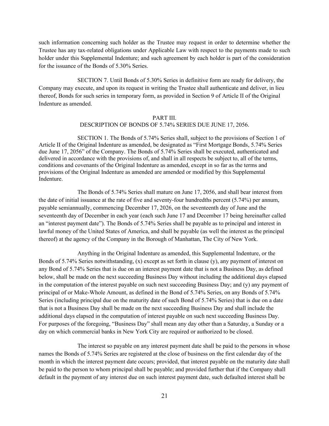 21 such information concerning such holder as the Trustee may request in order to determine whether the Trustee has any tax-related obligations under Applicable Law with respect to the payments made to such holder under this Supplemental Indenture; and such agreement by each holder is part of the consideration for the issuance of the Bonds of 5.30% Series. SECTION 7. Until Bonds of 5.30% Series in definitive form are ready for delivery, the Company may execute, and upon its request in writing the Trustee shall authenticate and deliver, in lieu thereof, Bonds for such series in temporary form, as provided in Section 9 of Article II of the Original Indenture as amended. PART III. DESCRIPTION OF BONDS OF 5.74% SERIES DUE JUNE 17, 2056. SECTION 1. The Bonds of 5.74% Series shall, subject to the provisions of Section 1 of Article II of the Original Indenture as amended, be designated as “First Mortgage Bonds, 5.74% Series due June 17, 2056” of the Company. The Bonds of 5.74% Series shall be executed, authenticated and delivered in accordance with the provisions of, and shall in all respects be subject to, all of the terms, conditions and covenants of the Original Indenture as amended, except in so far as the terms and provisions of the Original Indenture as amended are amended or modified by this Supplemental Indenture. The Bonds of 5.74% Series shall mature on June 17, 2056, and shall bear interest from the date of initial issuance at the rate of five and seventy-four hundredths percent (5.74%) per annum, payable semiannually, commencing December 17, 2026, on the seventeenth day of June and the seventeenth day of December in each year (each such June 17 and December 17 being hereinafter called an “interest payment date”). The Bonds of 5.74% Series shall be payable as to principal and interest in lawful money of the United States of America, and shall be payable (as well the interest as the principal thereof) at the agency of the Company in the Borough of Manhattan, The City of New York. Anything in the Original Indenture as amended, this Supplemental Indenture, or the Bonds of 5.74% Series notwithstanding, (x) except as set forth in clause (y), any payment of interest on any Bond of 5.74% Series that is due on an interest payment date that is not a Business Day, as defined below, shall be made on the next succeeding Business Day without including the additional days elapsed in the computation of the interest payable on such next succeeding Business Day; and (y) any payment of principal of or Make-Whole Amount, as defined in the Bond of 5.74% Series, on any Bonds of 5.74% Series (including principal due on the maturity date of such Bond of 5.74% Series) that is due on a date that is not a Business Day shall be made on the next succeeding Business Day and shall include the additional days elapsed in the computation of interest payable on such next succeeding Business Day. For purposes of the foregoing, “Business Day” shall mean any day other than a Saturday, a Sunday or a day on which commercial banks in New York City are required or authorized to be closed. The interest so payable on any interest payment date shall be paid to the persons in whose names the Bonds of 5.74% Series are registered at the close of business on the first calendar day of the month in which the interest payment date occurs; provided, that interest payable on the maturity date shall be paid to the person to whom principal shall be payable; and provided further that if the Company shall default in the payment of any interest due on such interest payment date, such defaulted interest shall be