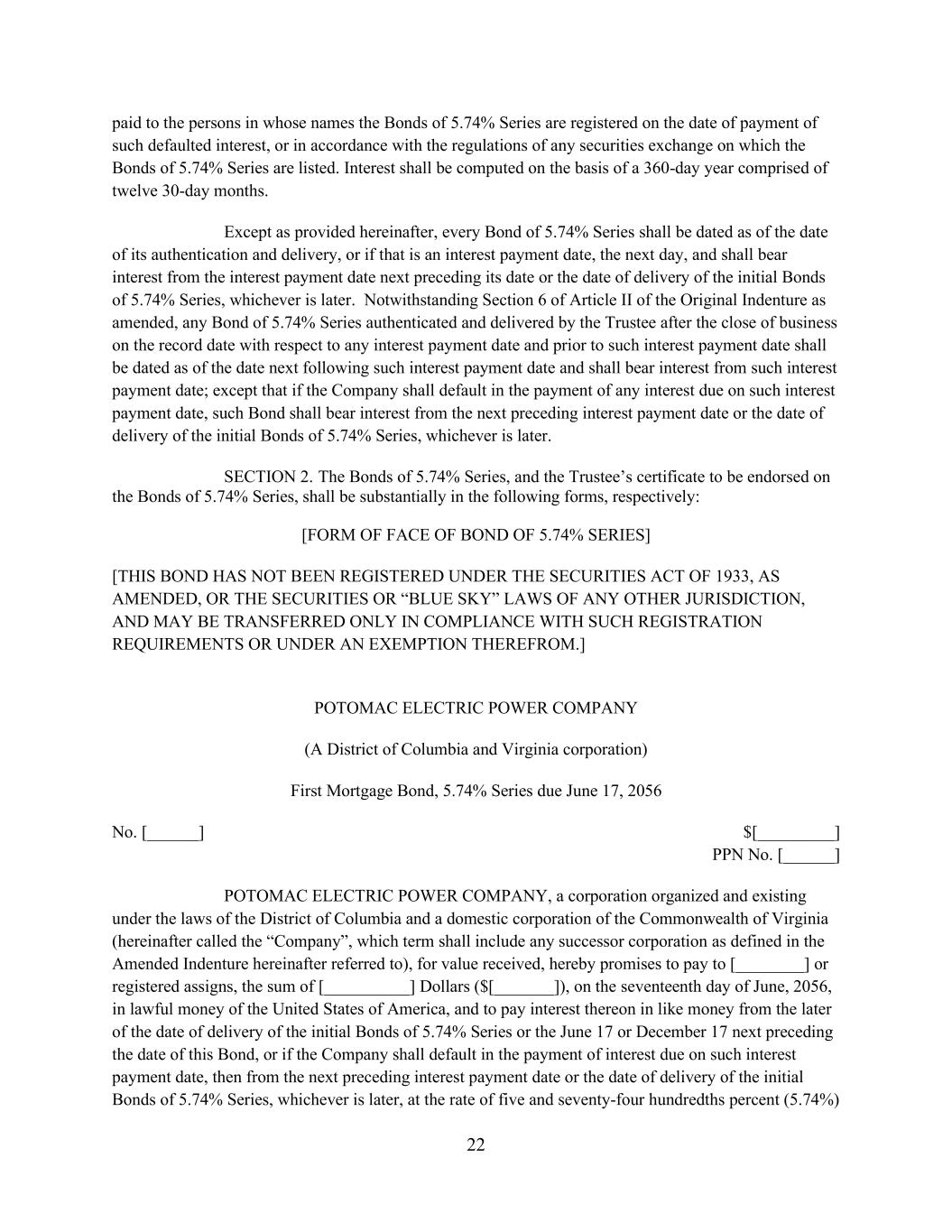 22 paid to the persons in whose names the Bonds of 5.74% Series are registered on the date of payment of such defaulted interest, or in accordance with the regulations of any securities exchange on which the Bonds of 5.74% Series are listed. Interest shall be computed on the basis of a 360-day year comprised of twelve 30-day months. Except as provided hereinafter, every Bond of 5.74% Series shall be dated as of the date of its authentication and delivery, or if that is an interest payment date, the next day, and shall bear interest from the interest payment date next preceding its date or the date of delivery of the initial Bonds of 5.74% Series, whichever is later. Notwithstanding Section 6 of Article II of the Original Indenture as amended, any Bond of 5.74% Series authenticated and delivered by the Trustee after the close of business on the record date with respect to any interest payment date and prior to such interest payment date shall be dated as of the date next following such interest payment date and shall bear interest from such interest payment date; except that if the Company shall default in the payment of any interest due on such interest payment date, such Bond shall bear interest from the next preceding interest payment date or the date of delivery of the initial Bonds of 5.74% Series, whichever is later. SECTION 2. The Bonds of 5.74% Series, and the Trustee’s certificate to be endorsed on the Bonds of 5.74% Series, shall be substantially in the following forms, respectively: [FORM OF FACE OF BOND OF 5.74% SERIES] [THIS BOND HAS NOT BEEN REGISTERED UNDER THE SECURITIES ACT OF 1933, AS AMENDED, OR THE SECURITIES OR “BLUE SKY” LAWS OF ANY OTHER JURISDICTION, AND MAY BE TRANSFERRED ONLY IN COMPLIANCE WITH SUCH REGISTRATION REQUIREMENTS OR UNDER AN EXEMPTION THEREFROM.] POTOMAC ELECTRIC POWER COMPANY (A District of Columbia and Virginia corporation) First Mortgage Bond, 5.74% Series due June 17, 2056 No. [______] $[_________] PPN No. [______] POTOMAC ELECTRIC POWER COMPANY, a corporation organized and existing under the laws of the District of Columbia and a domestic corporation of the Commonwealth of Virginia (hereinafter called the “Company”, which term shall include any successor corporation as defined in the Amended Indenture hereinafter referred to), for value received, hereby promises to pay to [________] or registered assigns, the sum of [__________] Dollars ($[_______]), on the seventeenth day of June, 2056, in lawful money of the United States of America, and to pay interest thereon in like money from the later of the date of delivery of the initial Bonds of 5.74% Series or the June 17 or December 17 next preceding the date of this Bond, or if the Company shall default in the payment of interest due on such interest payment date, then from the next preceding interest payment date or the date of delivery of the initial Bonds of 5.74% Series, whichever is later, at the rate of five and seventy-four hundredths percent (5.74%)