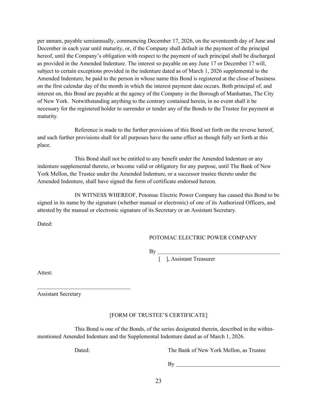 23 per annum, payable semiannually, commencing December 17, 2026, on the seventeenth day of June and December in each year until maturity, or, if the Company shall default in the payment of the principal hereof, until the Company’s obligation with respect to the payment of such principal shall be discharged as provided in the Amended Indenture. The interest so payable on any June 17 or December 17 will, subject to certain exceptions provided in the indenture dated as of March 1, 2026 supplemental to the Amended Indenture, be paid to the person in whose name this Bond is registered at the close of business on the first calendar day of the month in which the interest payment date occurs. Both principal of, and interest on, this Bond are payable at the agency of the Company in the Borough of Manhattan, The City of New York. Notwithstanding anything to the contrary contained herein, in no event shall it be necessary for the registered holder to surrender or tender any of the Bonds to the Trustee for payment at maturity. Reference is made to the further provisions of this Bond set forth on the reverse hereof, and such further provisions shall for all purposes have the same effect as though fully set forth at this place. This Bond shall not be entitled to any benefit under the Amended Indenture or any indenture supplemental thereto, or become valid or obligatory for any purpose, until The Bank of New York Mellon, the Trustee under the Amended Indenture, or a successor trustee thereto under the Amended Indenture, shall have signed the form of certificate endorsed hereon. IN WITNESS WHEREOF, Potomac Electric Power Company has caused this Bond to be signed in its name by the signature (whether manual or electronic) of one of its Authorized Officers, and attested by the manual or electronic signature of its Secretary or an Assistant Secretary. Dated: POTOMAC ELECTRIC POWER COMPANY By [ ], Assistant Treasurer Attest: Assistant Secretary [FORM OF TRUSTEE’S CERTIFICATE] This Bond is one of the Bonds, of the series designated therein, described in the within- mentioned Amended Indenture and the Supplemental Indenture dated as of March 1, 2026. Dated: The Bank of New York Mellon, as Trustee By
