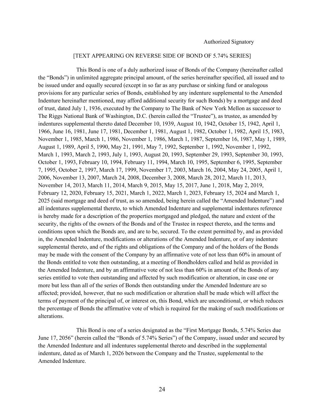 24 Authorized Signatory [TEXT APPEARING ON REVERSE SIDE OF BOND OF 5.74% SERIES] This Bond is one of a duly authorized issue of Bonds of the Company (hereinafter called the “Bonds”) in unlimited aggregate principal amount, of the series hereinafter specified, all issued and to be issued under and equally secured (except in so far as any purchase or sinking fund or analogous provisions for any particular series of Bonds, established by any indenture supplemental to the Amended Indenture hereinafter mentioned, may afford additional security for such Bonds) by a mortgage and deed of trust, dated July 1, 1936, executed by the Company to The Bank of New York Mellon as successor to The Riggs National Bank of Washington, D.C. (herein called the “Trustee”), as trustee, as amended by indentures supplemental thereto dated December 10, 1939, August 10, 1942, October 15, 1942, April 1, 1966, June 16, 1981, June 17, 1981, December 1, 1981, August 1, 1982, October 1, 1982, April 15, 1983, November 1, 1985, March 1, 1986, November 1, 1986, March 1, 1987, September 16, 1987, May 1, 1989, August 1, 1989, April 5, 1990, May 21, 1991, May 7, 1992, September 1, 1992, November 1, 1992, March 1, 1993, March 2, 1993, July 1, 1993, August 20, 1993, September 29, 1993, September 30, 1993, October 1, 1993, February 10, 1994, February 11, 1994, March 10, 1995, September 6, 1995, September 7, 1995, October 2, 1997, March 17, 1999, November 17, 2003, March 16, 2004, May 24, 2005, April 1, 2006, November 13, 2007, March 24, 2008, December 3, 2008, March 28, 2012, March 11, 2013, November 14, 2013, March 11, 2014, March 9, 2015, May 15, 2017, June 1, 2018, May 2, 2019, February 12, 2020, February 15, 2021, March 1, 2022, March 1, 2023, February 15, 2024 and March 1, 2025 (said mortgage and deed of trust, as so amended, being herein called the “Amended Indenture”) and all indentures supplemental thereto, to which Amended Indenture and supplemental indentures reference is hereby made for a description of the properties mortgaged and pledged, the nature and extent of the security, the rights of the owners of the Bonds and of the Trustee in respect thereto, and the terms and conditions upon which the Bonds are, and are to be, secured. To the extent permitted by, and as provided in, the Amended Indenture, modifications or alterations of the Amended Indenture, or of any indenture supplemental thereto, and of the rights and obligations of the Company and of the holders of the Bonds may be made with the consent of the Company by an affirmative vote of not less than 60% in amount of the Bonds entitled to vote then outstanding, at a meeting of Bondholders called and held as provided in the Amended Indenture, and by an affirmative vote of not less than 60% in amount of the Bonds of any series entitled to vote then outstanding and affected by such modification or alteration, in case one or more but less than all of the series of Bonds then outstanding under the Amended Indenture are so affected; provided, however, that no such modification or alteration shall be made which will affect the terms of payment of the principal of, or interest on, this Bond, which are unconditional, or which reduces the percentage of Bonds the affirmative vote of which is required for the making of such modifications or alterations. This Bond is one of a series designated as the “First Mortgage Bonds, 5.74% Series due June 17, 2056” (herein called the “Bonds of 5.74% Series”) of the Company, issued under and secured by the Amended Indenture and all indentures supplemental thereto and described in the supplemental indenture, dated as of March 1, 2026 between the Company and the Trustee, supplemental to the Amended Indenture.