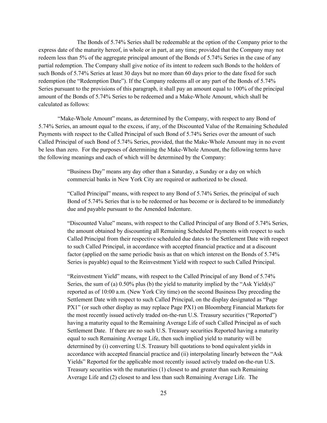 25 The Bonds of 5.74% Series shall be redeemable at the option of the Company prior to the express date of the maturity hereof, in whole or in part, at any time; provided that the Company may not redeem less than 5% of the aggregate principal amount of the Bonds of 5.74% Series in the case of any partial redemption. The Company shall give notice of its intent to redeem such Bonds to the holders of such Bonds of 5.74% Series at least 30 days but no more than 60 days prior to the date fixed for such redemption (the “Redemption Date”). If the Company redeems all or any part of the Bonds of 5.74% Series pursuant to the provisions of this paragraph, it shall pay an amount equal to 100% of the principal amount of the Bonds of 5.74% Series to be redeemed and a Make-Whole Amount, which shall be calculated as follows: “Make-Whole Amount” means, as determined by the Company, with respect to any Bond of 5.74% Series, an amount equal to the excess, if any, of the Discounted Value of the Remaining Scheduled Payments with respect to the Called Principal of such Bond of 5.74% Series over the amount of such Called Principal of such Bond of 5.74% Series, provided, that the Make-Whole Amount may in no event be less than zero. For the purposes of determining the Make-Whole Amount, the following terms have the following meanings and each of which will be determined by the Company: “Business Day” means any day other than a Saturday, a Sunday or a day on which commercial banks in New York City are required or authorized to be closed. “Called Principal” means, with respect to any Bond of 5.74% Series, the principal of such Bond of 5.74% Series that is to be redeemed or has become or is declared to be immediately due and payable pursuant to the Amended Indenture. “Discounted Value” means, with respect to the Called Principal of any Bond of 5.74% Series, the amount obtained by discounting all Remaining Scheduled Payments with respect to such Called Principal from their respective scheduled due dates to the Settlement Date with respect to such Called Principal, in accordance with accepted financial practice and at a discount factor (applied on the same periodic basis as that on which interest on the Bonds of 5.74% Series is payable) equal to the Reinvestment Yield with respect to such Called Principal. “Reinvestment Yield” means, with respect to the Called Principal of any Bond of 5.74% Series, the sum of (a) 0.50% plus (b) the yield to maturity implied by the “Ask Yield(s)” reported as of 10:00 a.m. (New York City time) on the second Business Day preceding the Settlement Date with respect to such Called Principal, on the display designated as “Page PX1” (or such other display as may replace Page PX1) on Bloomberg Financial Markets for the most recently issued actively traded on-the-run U.S. Treasury securities (“Reported”) having a maturity equal to the Remaining Average Life of such Called Principal as of such Settlement Date. If there are no such U.S. Treasury securities Reported having a maturity equal to such Remaining Average Life, then such implied yield to maturity will be determined by (i) converting U.S. Treasury bill quotations to bond equivalent yields in accordance with accepted financial practice and (ii) interpolating linearly between the “Ask Yields” Reported for the applicable most recently issued actively traded on-the-run U.S. Treasury securities with the maturities (1) closest to and greater than such Remaining Average Life and (2) closest to and less than such Remaining Average Life. The