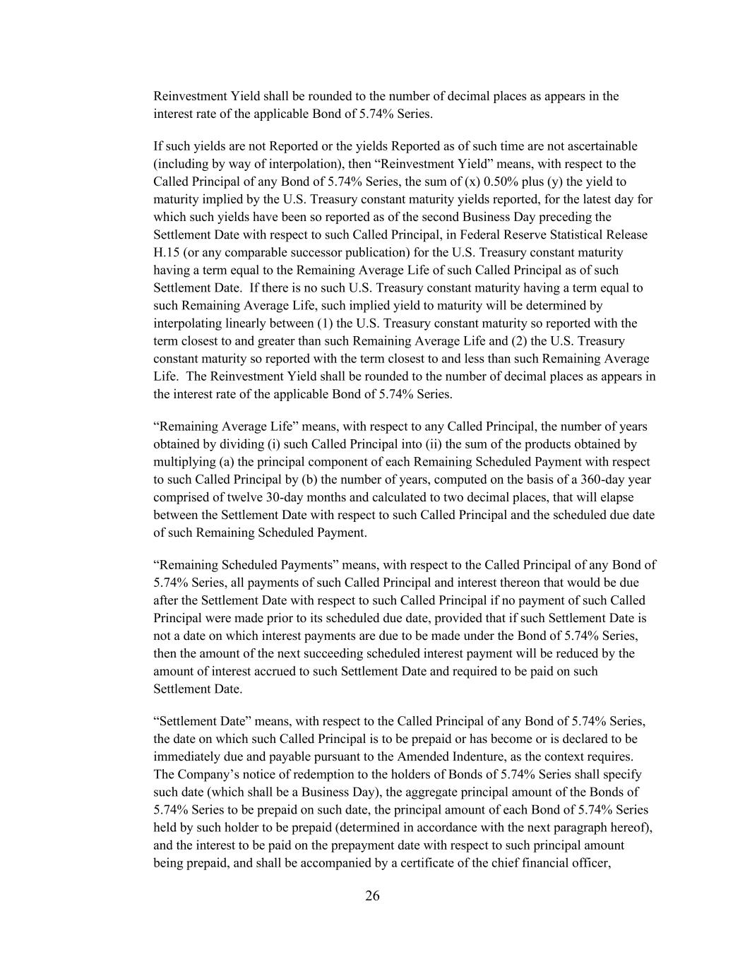 26 Reinvestment Yield shall be rounded to the number of decimal places as appears in the interest rate of the applicable Bond of 5.74% Series. If such yields are not Reported or the yields Reported as of such time are not ascertainable (including by way of interpolation), then “Reinvestment Yield” means, with respect to the Called Principal of any Bond of 5.74% Series, the sum of (x) 0.50% plus (y) the yield to maturity implied by the U.S. Treasury constant maturity yields reported, for the latest day for which such yields have been so reported as of the second Business Day preceding the Settlement Date with respect to such Called Principal, in Federal Reserve Statistical Release H.15 (or any comparable successor publication) for the U.S. Treasury constant maturity having a term equal to the Remaining Average Life of such Called Principal as of such Settlement Date. If there is no such U.S. Treasury constant maturity having a term equal to such Remaining Average Life, such implied yield to maturity will be determined by interpolating linearly between (1) the U.S. Treasury constant maturity so reported with the term closest to and greater than such Remaining Average Life and (2) the U.S. Treasury constant maturity so reported with the term closest to and less than such Remaining Average Life. The Reinvestment Yield shall be rounded to the number of decimal places as appears in the interest rate of the applicable Bond of 5.74% Series. “Remaining Average Life” means, with respect to any Called Principal, the number of years obtained by dividing (i) such Called Principal into (ii) the sum of the products obtained by multiplying (a) the principal component of each Remaining Scheduled Payment with respect to such Called Principal by (b) the number of years, computed on the basis of a 360-day year comprised of twelve 30-day months and calculated to two decimal places, that will elapse between the Settlement Date with respect to such Called Principal and the scheduled due date of such Remaining Scheduled Payment. “Remaining Scheduled Payments” means, with respect to the Called Principal of any Bond of 5.74% Series, all payments of such Called Principal and interest thereon that would be due after the Settlement Date with respect to such Called Principal if no payment of such Called Principal were made prior to its scheduled due date, provided that if such Settlement Date is not a date on which interest payments are due to be made under the Bond of 5.74% Series, then the amount of the next succeeding scheduled interest payment will be reduced by the amount of interest accrued to such Settlement Date and required to be paid on such Settlement Date. “Settlement Date” means, with respect to the Called Principal of any Bond of 5.74% Series, the date on which such Called Principal is to be prepaid or has become or is declared to be immediately due and payable pursuant to the Amended Indenture, as the context requires. The Company’s notice of redemption to the holders of Bonds of 5.74% Series shall specify such date (which shall be a Business Day), the aggregate principal amount of the Bonds of 5.74% Series to be prepaid on such date, the principal amount of each Bond of 5.74% Series held by such holder to be prepaid (determined in accordance with the next paragraph hereof), and the interest to be paid on the prepayment date with respect to such principal amount being prepaid, and shall be accompanied by a certificate of the chief financial officer,