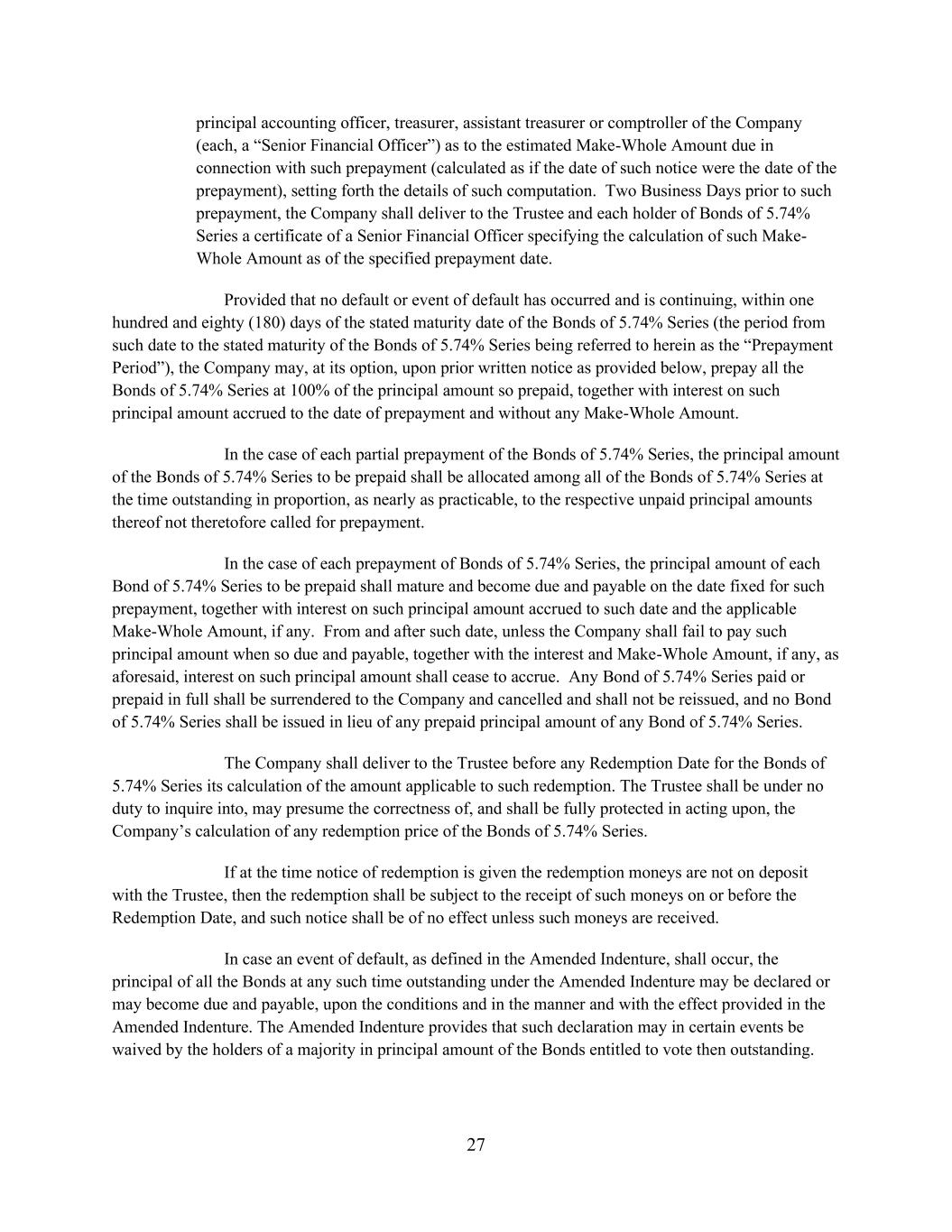 27 principal accounting officer, treasurer, assistant treasurer or comptroller of the Company (each, a “Senior Financial Officer”) as to the estimated Make-Whole Amount due in connection with such prepayment (calculated as if the date of such notice were the date of the prepayment), setting forth the details of such computation. Two Business Days prior to such prepayment, the Company shall deliver to the Trustee and each holder of Bonds of 5.74% Series a certificate of a Senior Financial Officer specifying the calculation of such Make- Whole Amount as of the specified prepayment date. Provided that no default or event of default has occurred and is continuing, within one hundred and eighty (180) days of the stated maturity date of the Bonds of 5.74% Series (the period from such date to the stated maturity of the Bonds of 5.74% Series being referred to herein as the “Prepayment Period”), the Company may, at its option, upon prior written notice as provided below, prepay all the Bonds of 5.74% Series at 100% of the principal amount so prepaid, together with interest on such principal amount accrued to the date of prepayment and without any Make-Whole Amount. In the case of each partial prepayment of the Bonds of 5.74% Series, the principal amount of the Bonds of 5.74% Series to be prepaid shall be allocated among all of the Bonds of 5.74% Series at the time outstanding in proportion, as nearly as practicable, to the respective unpaid principal amounts thereof not theretofore called for prepayment. In the case of each prepayment of Bonds of 5.74% Series, the principal amount of each Bond of 5.74% Series to be prepaid shall mature and become due and payable on the date fixed for such prepayment, together with interest on such principal amount accrued to such date and the applicable Make-Whole Amount, if any. From and after such date, unless the Company shall fail to pay such principal amount when so due and payable, together with the interest and Make-Whole Amount, if any, as aforesaid, interest on such principal amount shall cease to accrue. Any Bond of 5.74% Series paid or prepaid in full shall be surrendered to the Company and cancelled and shall not be reissued, and no Bond of 5.74% Series shall be issued in lieu of any prepaid principal amount of any Bond of 5.74% Series. The Company shall deliver to the Trustee before any Redemption Date for the Bonds of 5.74% Series its calculation of the amount applicable to such redemption. The Trustee shall be under no duty to inquire into, may presume the correctness of, and shall be fully protected in acting upon, the Company’s calculation of any redemption price of the Bonds of 5.74% Series. If at the time notice of redemption is given the redemption moneys are not on deposit with the Trustee, then the redemption shall be subject to the receipt of such moneys on or before the Redemption Date, and such notice shall be of no effect unless such moneys are received. In case an event of default, as defined in the Amended Indenture, shall occur, the principal of all the Bonds at any such time outstanding under the Amended Indenture may be declared or may become due and payable, upon the conditions and in the manner and with the effect provided in the Amended Indenture. The Amended Indenture provides that such declaration may in certain events be waived by the holders of a majority in principal amount of the Bonds entitled to vote then outstanding.