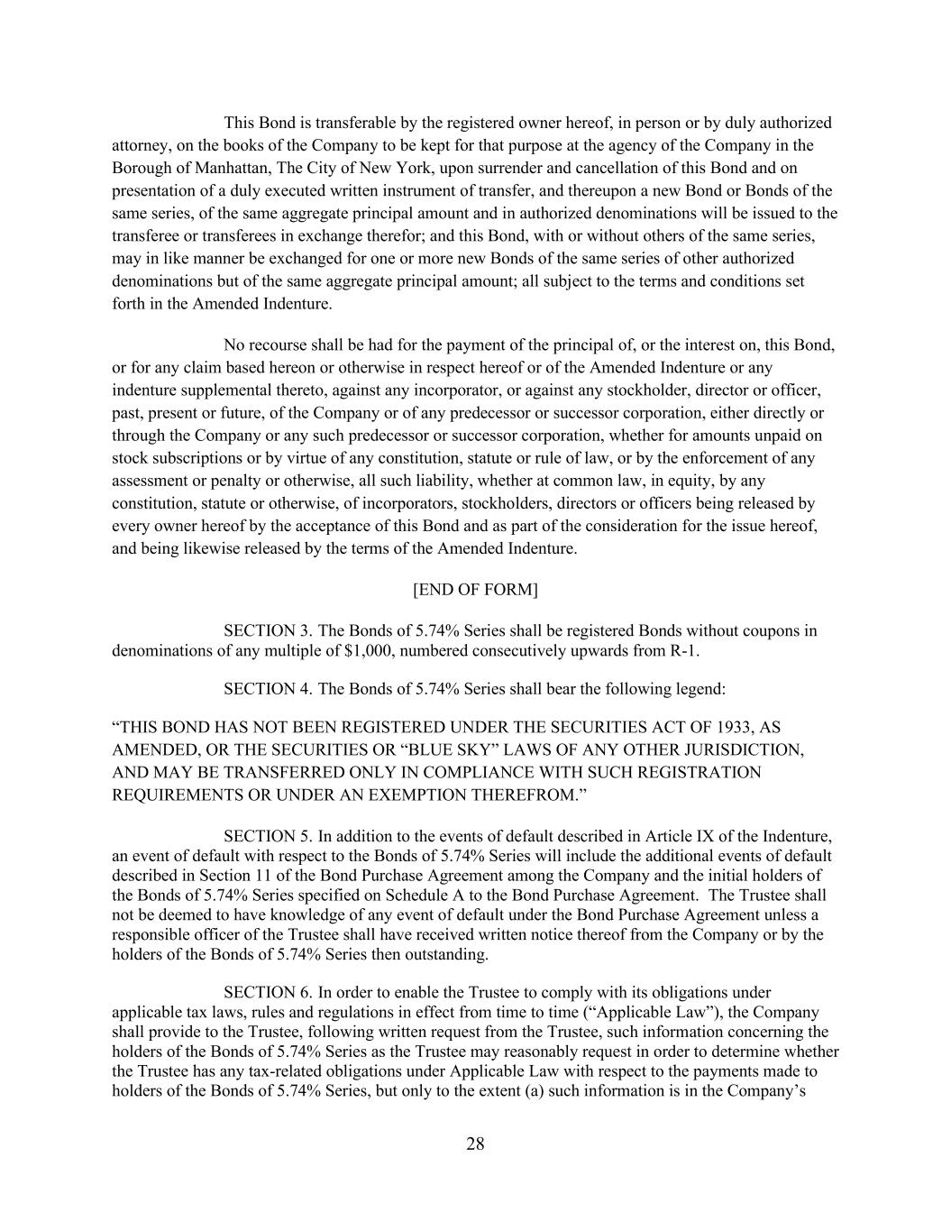 28 This Bond is transferable by the registered owner hereof, in person or by duly authorized attorney, on the books of the Company to be kept for that purpose at the agency of the Company in the Borough of Manhattan, The City of New York, upon surrender and cancellation of this Bond and on presentation of a duly executed written instrument of transfer, and thereupon a new Bond or Bonds of the same series, of the same aggregate principal amount and in authorized denominations will be issued to the transferee or transferees in exchange therefor; and this Bond, with or without others of the same series, may in like manner be exchanged for one or more new Bonds of the same series of other authorized denominations but of the same aggregate principal amount; all subject to the terms and conditions set forth in the Amended Indenture. No recourse shall be had for the payment of the principal of, or the interest on, this Bond, or for any claim based hereon or otherwise in respect hereof or of the Amended Indenture or any indenture supplemental thereto, against any incorporator, or against any stockholder, director or officer, past, present or future, of the Company or of any predecessor or successor corporation, either directly or through the Company or any such predecessor or successor corporation, whether for amounts unpaid on stock subscriptions or by virtue of any constitution, statute or rule of law, or by the enforcement of any assessment or penalty or otherwise, all such liability, whether at common law, in equity, by any constitution, statute or otherwise, of incorporators, stockholders, directors or officers being released by every owner hereof by the acceptance of this Bond and as part of the consideration for the issue hereof, and being likewise released by the terms of the Amended Indenture. [END OF FORM] SECTION 3. The Bonds of 5.74% Series shall be registered Bonds without coupons in denominations of any multiple of $1,000, numbered consecutively upwards from R-1. SECTION 4. The Bonds of 5.74% Series shall bear the following legend: “THIS BOND HAS NOT BEEN REGISTERED UNDER THE SECURITIES ACT OF 1933, AS AMENDED, OR THE SECURITIES OR “BLUE SKY” LAWS OF ANY OTHER JURISDICTION, AND MAY BE TRANSFERRED ONLY IN COMPLIANCE WITH SUCH REGISTRATION REQUIREMENTS OR UNDER AN EXEMPTION THEREFROM.” SECTION 5. In addition to the events of default described in Article IX of the Indenture, an event of default with respect to the Bonds of 5.74% Series will include the additional events of default described in Section 11 of the Bond Purchase Agreement among the Company and the initial holders of the Bonds of 5.74% Series specified on Schedule A to the Bond Purchase Agreement. The Trustee shall not be deemed to have knowledge of any event of default under the Bond Purchase Agreement unless a responsible officer of the Trustee shall have received written notice thereof from the Company or by the holders of the Bonds of 5.74% Series then outstanding. SECTION 6. In order to enable the Trustee to comply with its obligations under applicable tax laws, rules and regulations in effect from time to time (“Applicable Law”), the Company shall provide to the Trustee, following written request from the Trustee, such information concerning the holders of the Bonds of 5.74% Series as the Trustee may reasonably request in order to determine whether the Trustee has any tax-related obligations under Applicable Law with respect to the payments made to holders of the Bonds of 5.74% Series, but only to the extent (a) such information is in the Company’s