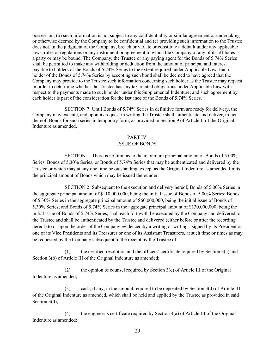 29 possession, (b) such information is not subject to any confidentiality or similar agreement or undertaking or otherwise deemed by the Company to be confidential and (c) providing such information to the Trustee does not, in the judgment of the Company, breach or violate or constitute a default under any applicable laws, rules or regulations or any instrument or agreement to which the Company of any of its affiliates is a party or may be bound. The Company, the Trustee or any paying agent for the Bonds of 5.74% Series shall be permitted to make any withholding or deduction from the amount of principal and interest payable to holders of the Bonds of 5.74% Series to the extent required under Applicable Law. Each holder of the Bonds of 5.74% Series by accepting such bond shall be deemed to have agreed that the Company may provide to the Trustee such information concerning such holder as the Trustee may request in order to determine whether the Trustee has any tax-related obligations under Applicable Law with respect to the payments made to such holder under this Supplemental Indenture; and such agreement by each holder is part of the consideration for the issuance of the Bonds of 5.74% Series. SECTION 7. Until Bonds of 5.74% Series in definitive form are ready for delivery, the Company may execute, and upon its request in writing the Trustee shall authenticate and deliver, in lieu thereof, Bonds for such series in temporary form, as provided in Section 9 of Article II of the Original Indenture as amended. PART IV. ISSUE OF BONDS. SECTION 1. There is no limit as to the maximum principal amount of Bonds of 5.00% Series, Bonds of 5.30% Series, or Bonds of 5.74% Series that may be authenticated and delivered by the Trustee or which may at any one time be outstanding, except as the Original Indenture as amended limits the principal amount of Bonds which may be issued thereunder. SECTION 2. Subsequent to the execution and delivery hereof, Bonds of 5.00% Series in the aggregate principal amount of $110,000,000, being the initial issue of Bonds of 5.00% Series; Bonds of 5.30% Series in the aggregate principal amount of $60,000,000, being the initial issue of Bonds of 5.30% Series; and Bonds of 5.74% Series in the aggregate principal amount of $130,000,000, being the initial issue of Bonds of 5.74% Series, shall each forthwith be executed by the Company and delivered to the Trustee and shall be authenticated by the Trustee and delivered (either before or after the recording hereof) to or upon the order of the Company evidenced by a writing or writings, signed by its President or one of its Vice Presidents and its Treasurer or one of its Assistant Treasurers, at such time or times as may be requested by the Company subsequent to the receipt by the Trustee of: (1) the certified resolution and the officers’ certificate required by Section 3(a) and Section 3(b) of Article III of the Original Indenture as amended; (2) the opinion of counsel required by Section 3(c) of Article III of the Original Indenture as amended; (3) cash, if any, in the amount required to be deposited by Section 3(d) of Article III of the Original Indenture as amended, which shall be held and applied by the Trustee as provided in said Section 3(d); (4) the engineer’s certificate required by Section 4(a) of Article III of the Original Indenture as amended;