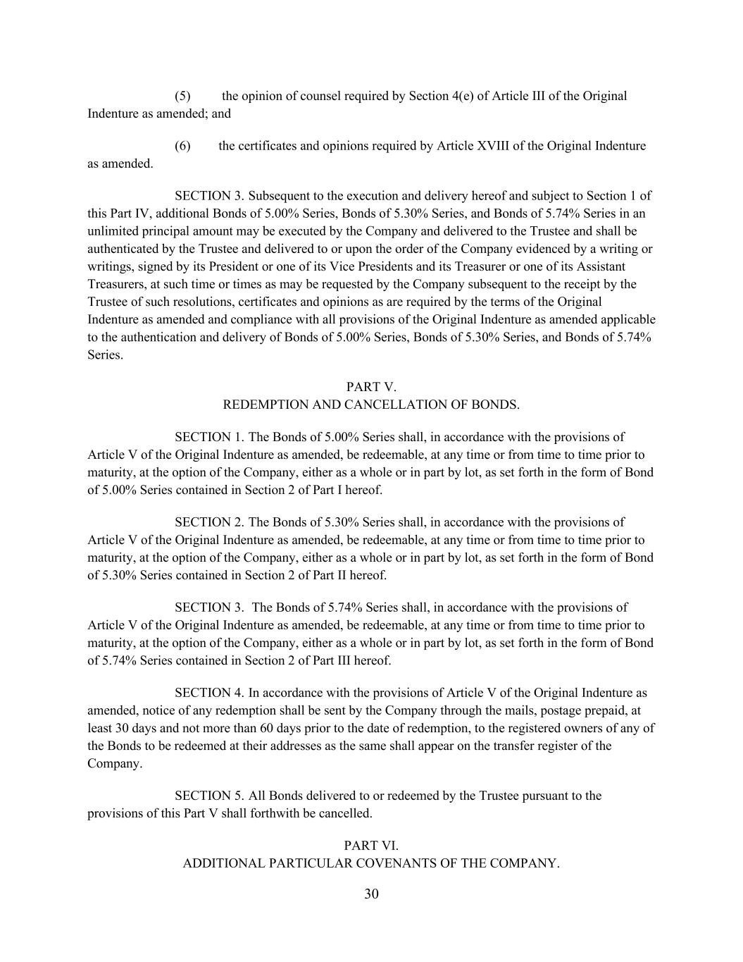 30 (5) the opinion of counsel required by Section 4(e) of Article III of the Original Indenture as amended; and (6) the certificates and opinions required by Article XVIII of the Original Indenture as amended. SECTION 3. Subsequent to the execution and delivery hereof and subject to Section 1 of this Part IV, additional Bonds of 5.00% Series, Bonds of 5.30% Series, and Bonds of 5.74% Series in an unlimited principal amount may be executed by the Company and delivered to the Trustee and shall be authenticated by the Trustee and delivered to or upon the order of the Company evidenced by a writing or writings, signed by its President or one of its Vice Presidents and its Treasurer or one of its Assistant Treasurers, at such time or times as may be requested by the Company subsequent to the receipt by the Trustee of such resolutions, certificates and opinions as are required by the terms of the Original Indenture as amended and compliance with all provisions of the Original Indenture as amended applicable to the authentication and delivery of Bonds of 5.00% Series, Bonds of 5.30% Series, and Bonds of 5.74% Series. PART V. REDEMPTION AND CANCELLATION OF BONDS. SECTION 1. The Bonds of 5.00% Series shall, in accordance with the provisions of Article V of the Original Indenture as amended, be redeemable, at any time or from time to time prior to maturity, at the option of the Company, either as a whole or in part by lot, as set forth in the form of Bond of 5.00% Series contained in Section 2 of Part I hereof. SECTION 2. The Bonds of 5.30% Series shall, in accordance with the provisions of Article V of the Original Indenture as amended, be redeemable, at any time or from time to time prior to maturity, at the option of the Company, either as a whole or in part by lot, as set forth in the form of Bond of 5.30% Series contained in Section 2 of Part II hereof. SECTION 3. The Bonds of 5.74% Series shall, in accordance with the provisions of Article V of the Original Indenture as amended, be redeemable, at any time or from time to time prior to maturity, at the option of the Company, either as a whole or in part by lot, as set forth in the form of Bond of 5.74% Series contained in Section 2 of Part III hereof. SECTION 4. In accordance with the provisions of Article V of the Original Indenture as amended, notice of any redemption shall be sent by the Company through the mails, postage prepaid, at least 30 days and not more than 60 days prior to the date of redemption, to the registered owners of any of the Bonds to be redeemed at their addresses as the same shall appear on the transfer register of the Company. SECTION 5. All Bonds delivered to or redeemed by the Trustee pursuant to the provisions of this Part V shall forthwith be cancelled. PART VI. ADDITIONAL PARTICULAR COVENANTS OF THE COMPANY.