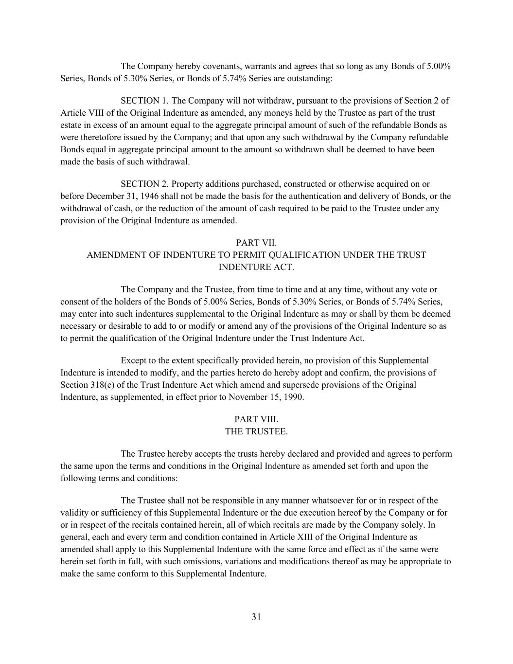 31 The Company hereby covenants, warrants and agrees that so long as any Bonds of 5.00% Series, Bonds of 5.30% Series, or Bonds of 5.74% Series are outstanding: SECTION 1. The Company will not withdraw, pursuant to the provisions of Section 2 of Article VIII of the Original Indenture as amended, any moneys held by the Trustee as part of the trust estate in excess of an amount equal to the aggregate principal amount of such of the refundable Bonds as were theretofore issued by the Company; and that upon any such withdrawal by the Company refundable Bonds equal in aggregate principal amount to the amount so withdrawn shall be deemed to have been made the basis of such withdrawal. SECTION 2. Property additions purchased, constructed or otherwise acquired on or before December 31, 1946 shall not be made the basis for the authentication and delivery of Bonds, or the withdrawal of cash, or the reduction of the amount of cash required to be paid to the Trustee under any provision of the Original Indenture as amended. PART VII. AMENDMENT OF INDENTURE TO PERMIT QUALIFICATION UNDER THE TRUST INDENTURE ACT. The Company and the Trustee, from time to time and at any time, without any vote or consent of the holders of the Bonds of 5.00% Series, Bonds of 5.30% Series, or Bonds of 5.74% Series, may enter into such indentures supplemental to the Original Indenture as may or shall by them be deemed necessary or desirable to add to or modify or amend any of the provisions of the Original Indenture so as to permit the qualification of the Original Indenture under the Trust Indenture Act. Except to the extent specifically provided herein, no provision of this Supplemental Indenture is intended to modify, and the parties hereto do hereby adopt and confirm, the provisions of Section 318(c) of the Trust Indenture Act which amend and supersede provisions of the Original Indenture, as supplemented, in effect prior to November 15, 1990. PART VIII. THE TRUSTEE. The Trustee hereby accepts the trusts hereby declared and provided and agrees to perform the same upon the terms and conditions in the Original Indenture as amended set forth and upon the following terms and conditions: The Trustee shall not be responsible in any manner whatsoever for or in respect of the validity or sufficiency of this Supplemental Indenture or the due execution hereof by the Company or for or in respect of the recitals contained herein, all of which recitals are made by the Company solely. In general, each and every term and condition contained in Article XIII of the Original Indenture as amended shall apply to this Supplemental Indenture with the same force and effect as if the same were herein set forth in full, with such omissions, variations and modifications thereof as may be appropriate to make the same conform to this Supplemental Indenture.