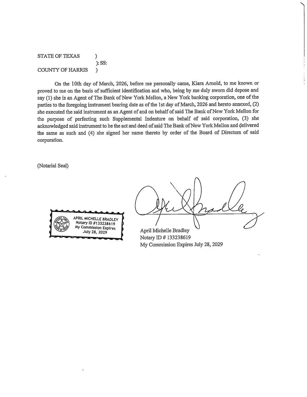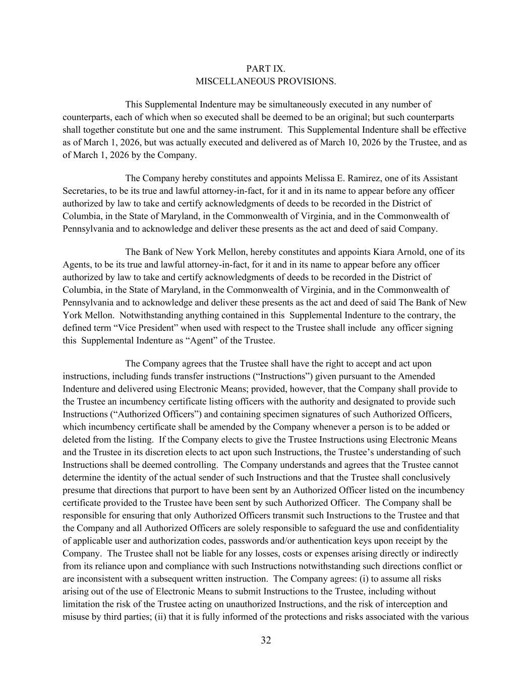 32 PART IX. MISCELLANEOUS PROVISIONS. This Supplemental Indenture may be simultaneously executed in any number of counterparts, each of which when so executed shall be deemed to be an original; but such counterparts shall together constitute but one and the same instrument. This Supplemental Indenture shall be effective as of March 1, 2026, but was actually executed and delivered as of March 10, 2026 by the Trustee, and as of March 1, 2026 by the Company. The Company hereby constitutes and appoints Melissa E. Ramirez, one of its Assistant Secretaries, to be its true and lawful attorney-in-fact, for it and in its name to appear before any officer authorized by law to take and certify acknowledgments of deeds to be recorded in the District of Columbia, in the State of Maryland, in the Commonwealth of Virginia, and in the Commonwealth of Pennsylvania and to acknowledge and deliver these presents as the act and deed of said Company. The Bank of New York Mellon, hereby constitutes and appoints Kiara Arnold, one of its Agents, to be its true and lawful attorney-in-fact, for it and in its name to appear before any officer authorized by law to take and certify acknowledgments of deeds to be recorded in the District of Columbia, in the State of Maryland, in the Commonwealth of Virginia, and in the Commonwealth of Pennsylvania and to acknowledge and deliver these presents as the act and deed of said The Bank of New York Mellon. Notwithstanding anything contained in this Supplemental Indenture to the contrary, the defined term “Vice President” when used with respect to the Trustee shall include any officer signing this Supplemental Indenture as “Agent” of the Trustee. The Company agrees that the Trustee shall have the right to accept and act upon instructions, including funds transfer instructions (“Instructions”) given pursuant to the Amended Indenture and delivered using Electronic Means; provided, however, that the Company shall provide to the Trustee an incumbency certificate listing officers with the authority and designated to provide such Instructions (“Authorized Officers”) and containing specimen signatures of such Authorized Officers, which incumbency certificate shall be amended by the Company whenever a person is to be added or deleted from the listing. If the Company elects to give the Trustee Instructions using Electronic Means and the Trustee in its discretion elects to act upon such Instructions, the Trustee’s understanding of such Instructions shall be deemed controlling. The Company understands and agrees that the Trustee cannot determine the identity of the actual sender of such Instructions and that the Trustee shall conclusively presume that directions that purport to have been sent by an Authorized Officer listed on the incumbency certificate provided to the Trustee have been sent by such Authorized Officer. The Company shall be responsible for ensuring that only Authorized Officers transmit such Instructions to the Trustee and that the Company and all Authorized Officers are solely responsible to safeguard the use and confidentiality of applicable user and authorization codes, passwords and/or authentication keys upon receipt by the Company. The Trustee shall not be liable for any losses, costs or expenses arising directly or indirectly from its reliance upon and compliance with such Instructions notwithstanding such directions conflict or are inconsistent with a subsequent written instruction. The Company agrees: (i) to assume all risks arising out of the use of Electronic Means to submit Instructions to the Trustee, including without limitation the risk of the Trustee acting on unauthorized Instructions, and the risk of interception and misuse by third parties; (ii) that it is fully informed of the protections and risks associated with the various