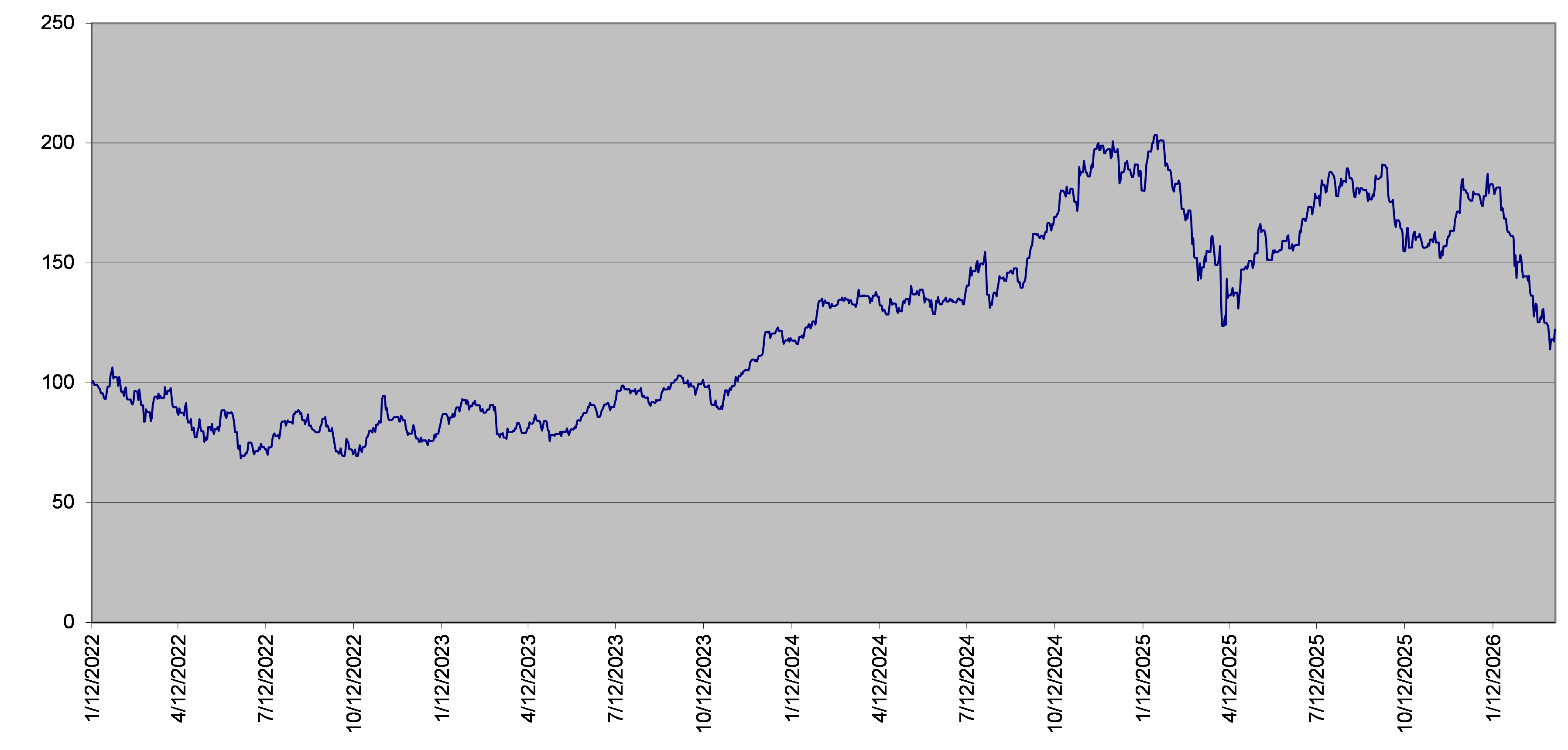 The following graph is calculated to show the performance of the Basket during the period from January 12, 2022 through March 17, 2026, assuming the Basket Underliers were weighted as set forth herein and that the weightings were set on January 12, 2022 such that the initial basket level of the Basket were 100, and illustrates the effect of the offset and/or correlation among the Basket Underliers during such period. The graph does not take into account the Threshold Settlement Amount, nor does it attempt to show your expected return on an investment in the notes. The historical values of the Basket should not be taken as an indication of its future performance.