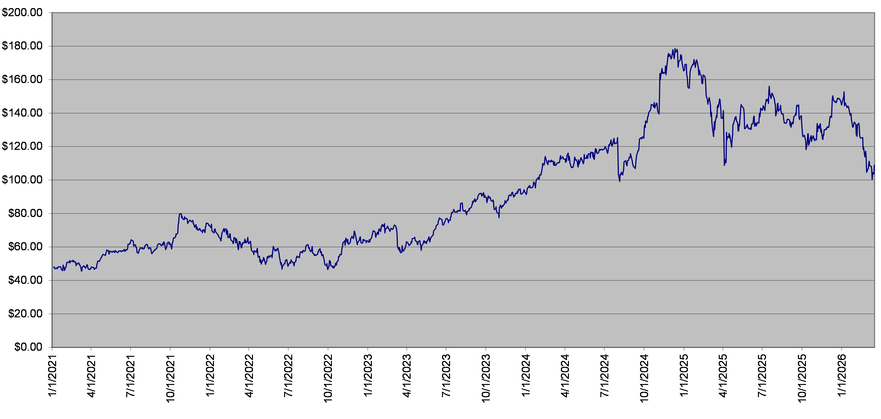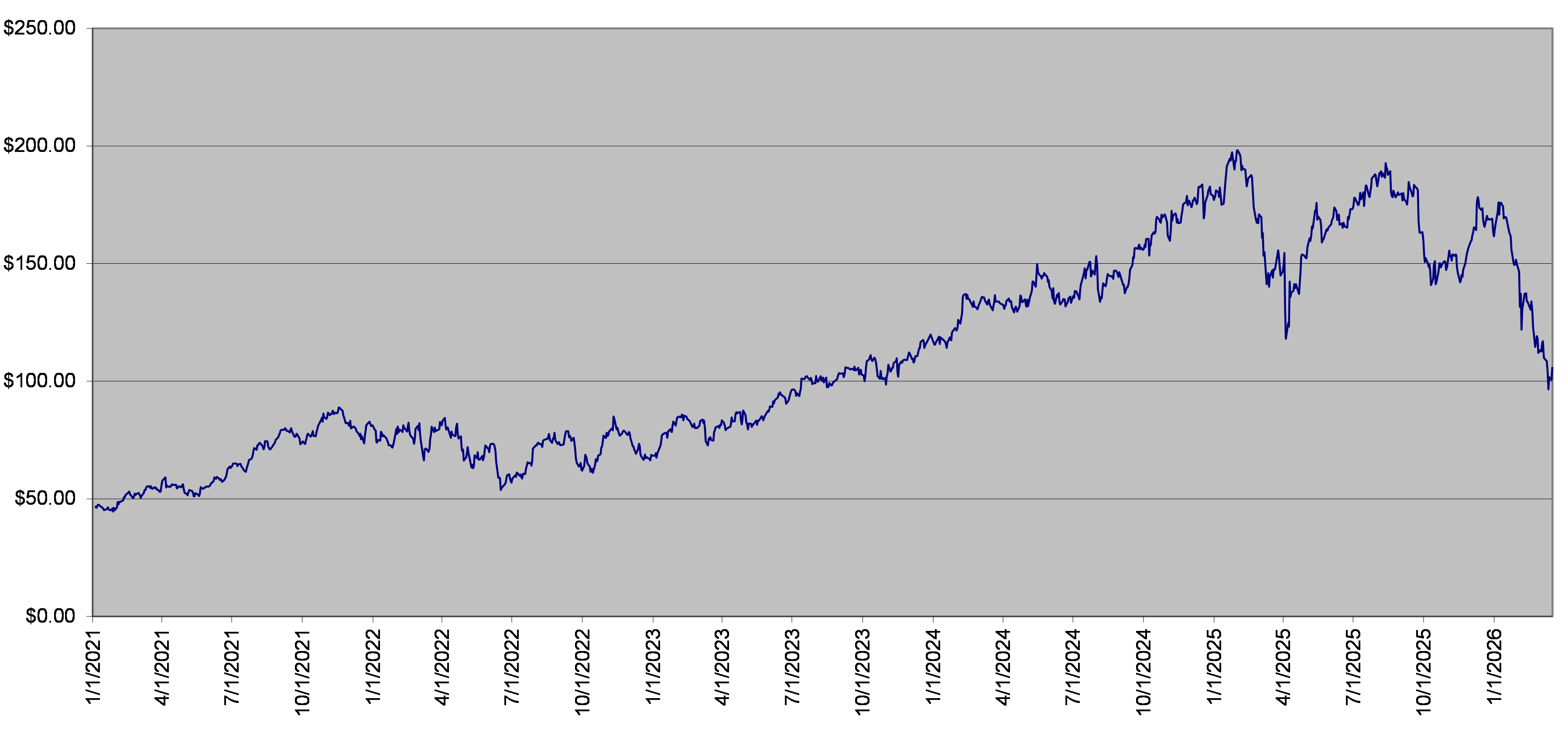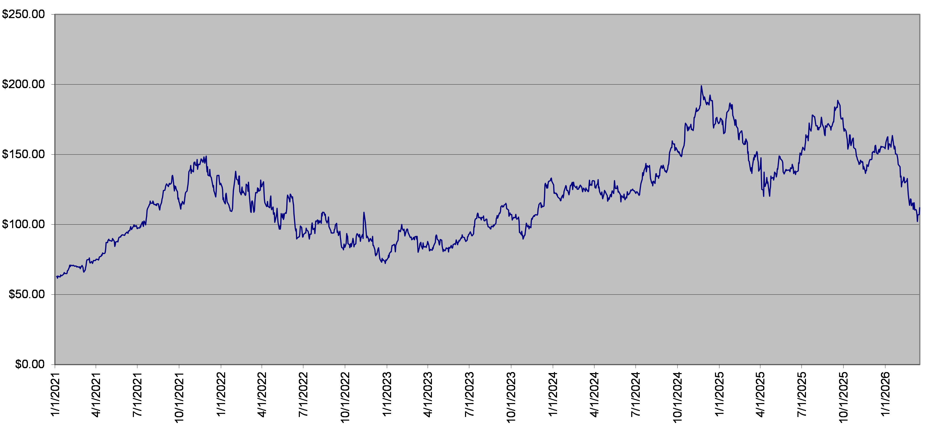 The following graph sets forth the daily Closing Levels of the ARES Stock for each quarter in the period from January 1, 2021 through March 17, 2026, adjusted for corporate events, if applicable. The Closing Level of the ARES Stock on March 17, 2026 was $105.67. We obtained the information in the graph below from Bloomberg Financial Markets without independent verification. The ARES Stock has at times experienced periods of high volatility. The actual performance of the ARES Stock over the term of the notes, as well as the amount payable at maturity, may bear little relation to the historical Closing Levels of the ARES Stock or to the hypothetical return examples set forth herein. We cannot predict the future performance of the ARES Stock. You should not take the historical levels of the ARES Stock as an indication of its future performance, and no assurance can be given as to the Closing Level of the ARES Stock on the Determination Date.