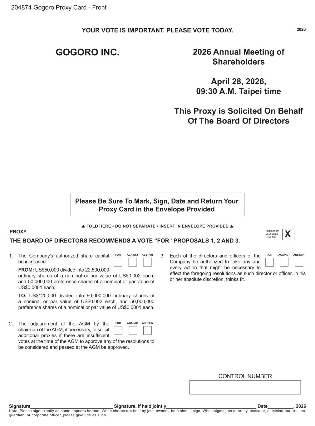 2026 3. Each of the directors and officers of the Company be authorized to take any and every action that might be necessary to effect the foregoing resolutions as such director or officer, in his or her absolute discretion, thinks fit. GOGORO INC. FOLD HERE • DO NOT SEPARATE • INSERT IN ENVELOPE PROVIDED Signature________________________________ Signature, if held jointly___________________________________ Date__________, 2026 Note: Please sign exactly as name appears hereon. When shares are held by joint owners, both should sign. When signing as attorney, executor, administrator, trustee, guardian, or corporate officer, please give title as such. Please mark your votes like this X YOUR VOTE IS IMPORTANT. PLEASE VOTE TODAY. 204874 Gogoro Proxy Card - Front 2026 Annual Meeting of Shareholders April 28, 2026, 09:30 A.M. Taipei time This Proxy is Solicited On Behalf Of The Board Of Directors Please Be Sure To Mark, Sign, Date and Return Your Proxy Card in the Envelope Provided CONTROL NUMBER 1. The Company’s authorized share capital be increased: FROM: US$50,000 divided into 22,500,000 ordinary shares of a nominal or par value of US$0.002 each, and 50,000,000 preference shares of a nominal or par value of US$0.0001 each; TO: US$120,000 divided into 60,000,000 ordinary shares of a nominal or par value of US$0.002 each, and 50,000,000 preference shares of a nominal or par value of US$0.0001 each. 2. The adjournment of the AGM by the chairman of the AGM, if necessary, to solicit additional proxies if there are insufficient votes at the time of the AGM to approve any of the resolutions to be considered and passed at the AGM be approved. FOR AGAINST ABSTAIN FOR AGAINST ABSTAIN FOR AGAINST ABSTAIN PROXY THE BOARD OF DIRECTORS RECOMMENDS A VOTE “FOR” PROPOSALS 1, 2 AND 3.