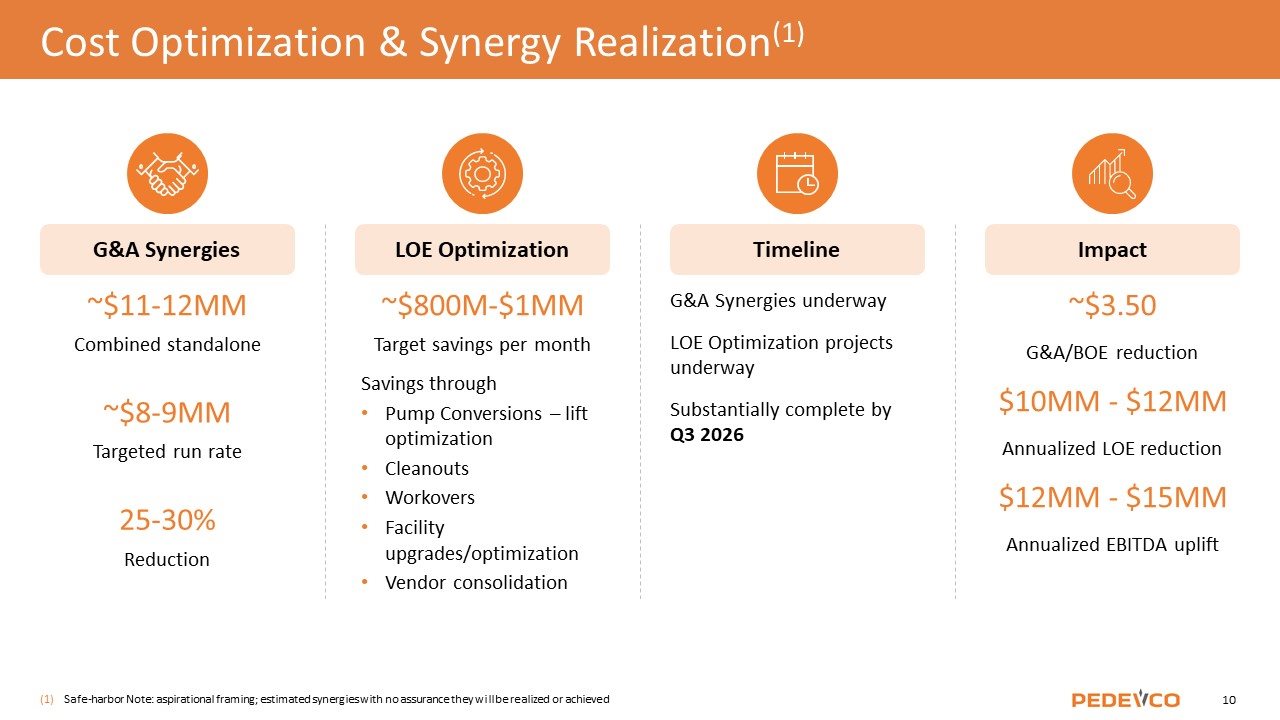 ~$11-12MM Combined standalone G&A Synergies ~$800M-$1MM Target savings per month LOE Optimization G&A Synergies underway LOE Optimization projects underway Substantially complete by Q3 2026 Timeline ~$3.50 G&A/BOE reduction $10MM - $12MM Annualized LOE reduction $12MM - $15MM Annualized EBITDA uplift Impact ~$8-9MM Targeted run rate Savings through Pump Conversions – lift optimization Cleanouts Workovers Facility upgrades/optimization Vendor consolidation 25-30% Reduction Cost Optimization & Synergy Realization(1) Safe-harbor Note: aspirational framing; estimated synergies with no assurance they will be realized or achieved