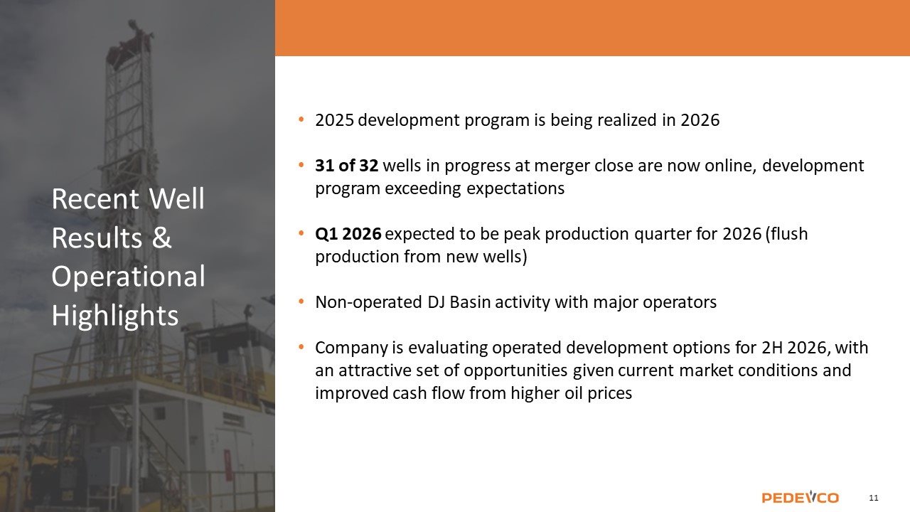 2025 development program is being realized in 2026 31 of 32 wells in progress at merger close are now online, development program exceeding expectations Q1 2026 expected to be peak production quarter for 2026 (flush production from new wells) Non-operated DJ Basin activity with major operators Company is evaluating operated development options for 2H 2026, with an attractive set of opportunities given current market conditions and improved cash flow from higher oil prices Recent Well Results & Operational Highlights