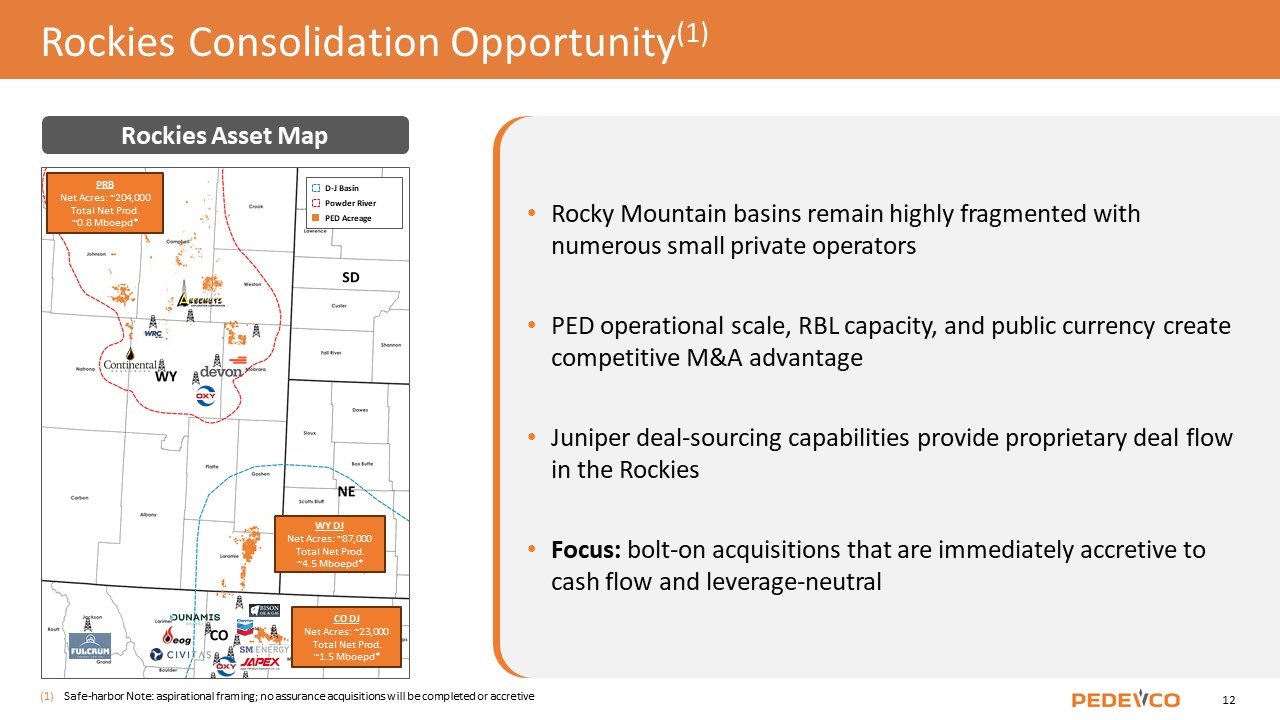 Rockies Asset Map Rocky Mountain basins remain highly fragmented with numerous small private operators PED operational scale, RBL capacity, and public currency create competitive M&A advantage Juniper deal-sourcing capabilities provide proprietary deal flow in the Rockies Focus: bolt-on acquisitions that are immediately accretive to cash flow and leverage-neutral Rockies Consolidation Opportunity(1) Safe-harbor Note: aspirational framing; no assurance acquisitions will be completed or accretive