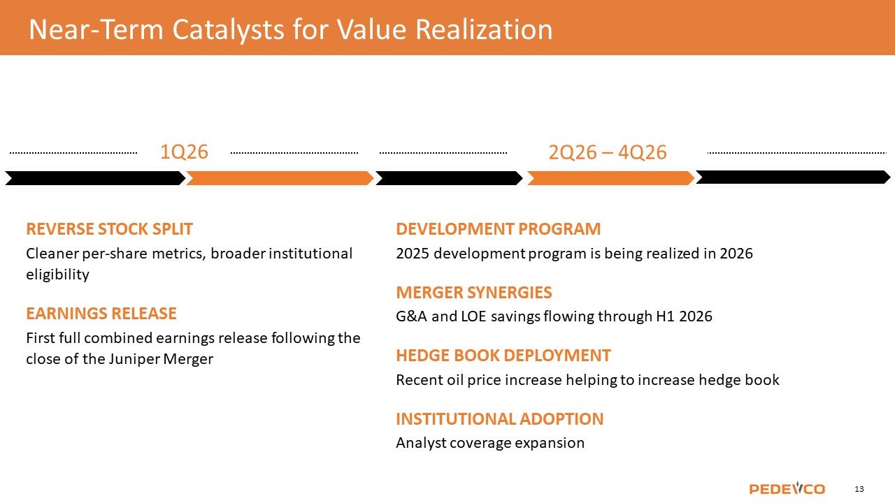 Near-Term Catalysts for Value Realization REVERSE STOCK SPLIT Cleaner per-share metrics, broader institutional eligibility EARNINGS RELEASE First full combined earnings release following the close of the Juniper Merger DEVELOPMENT PROGRAM 2025 development program is being realized in 2026 MERGER SYNERGIES G&A and LOE savings flowing through H1 2026 HEDGE BOOK DEPLOYMENT Recent oil price increase helping to increase hedge book INSTITUTIONAL ADOPTION Analyst coverage expansion 1Q26 2Q26 – 4Q26