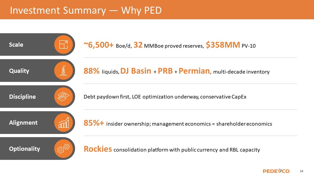 Scale Quality Discipline Alignment Optionality ~6,500+ Boe/d, 32 MMBoe proved reserves, $358MM PV-10 88% liquids, DJ Basin + PRB + Permian, multi-decade inventory Debt paydown first, LOE optimization underway, conservative CapEx 85%+ insider ownership; management economics = shareholder economics Rockies consolidation platform with public currency and RBL capacity Investment Summary — Why PED