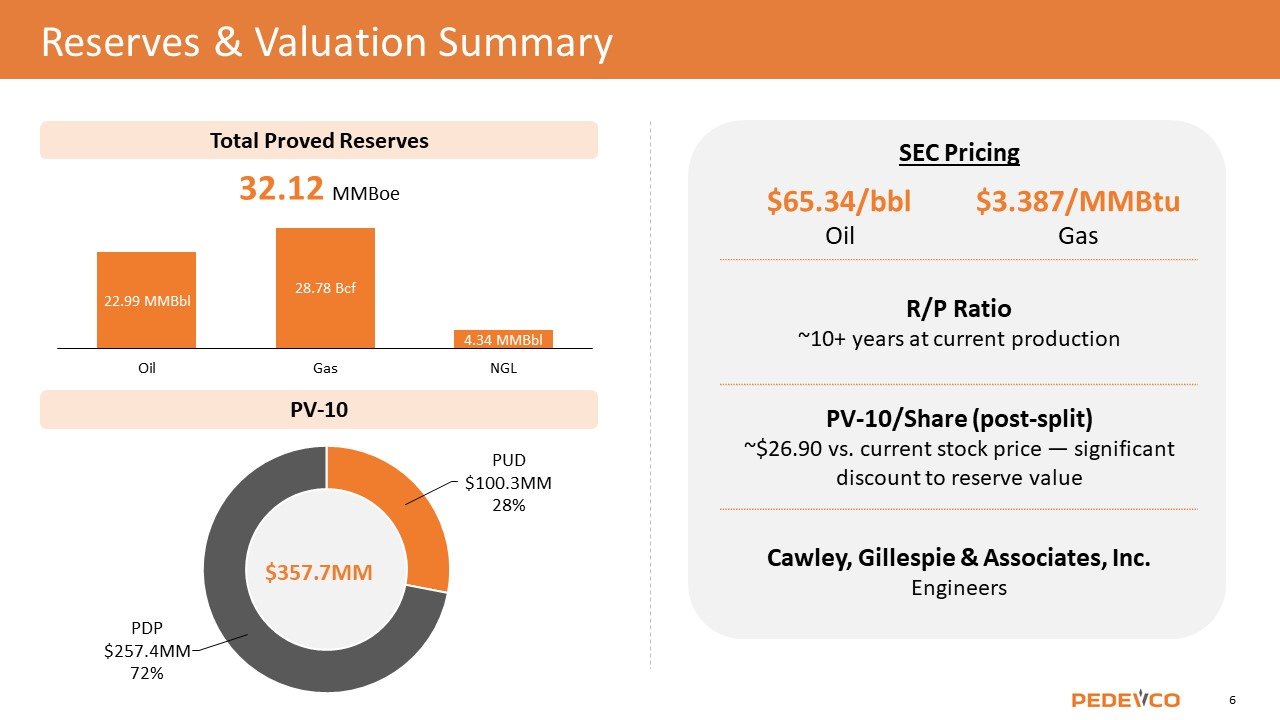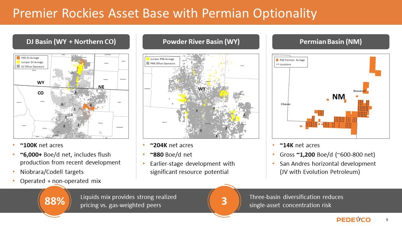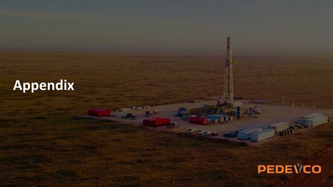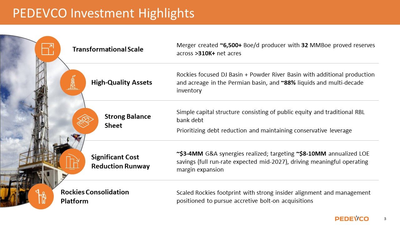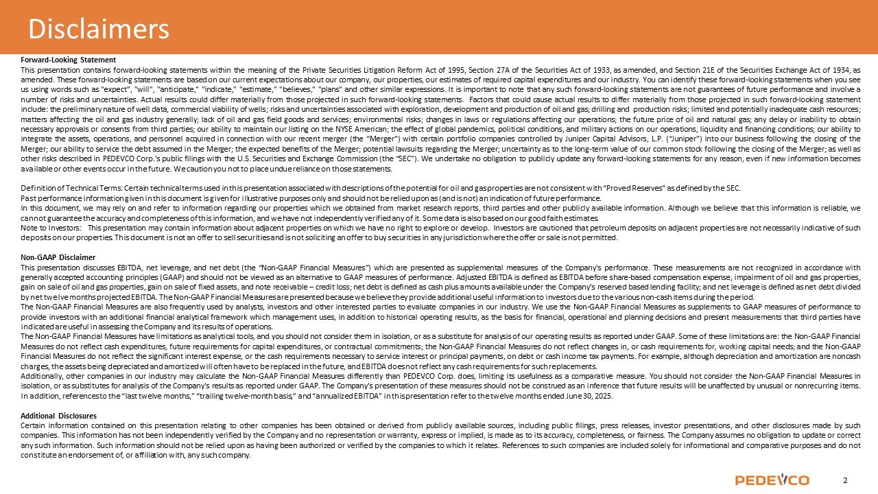 Forward-Looking Statement This presentation contains forward-looking statements within the meaning of the Private Securities Litigation Reform Act of 1995, Section 27A of the Securities Act of 1933, as amended, and Section 21E of the Securities Exchange Act of 1934, as amended. These forward-looking statements are based on our current expectations about our company, our properties, our estimates of required capital expenditures and our industry. You can identify these forward-looking statements when you see us using words such as "expect”, "will", "anticipate," "indicate," "estimate," "believes," "plans" and other similar expressions. It is important to note that any such forward-looking statements are not guarantees of future performance and involve a number of risks and uncertainties. Actual results could differ materially from those projected in such forward-looking statements. Factors that could cause actual results to differ materially from those projected in such forward-looking statement include: the preliminary nature of well data, commercial viability of wells; risks and uncertainties associated with exploration, development and production of oil and gas; drilling and production risks; limited and potentially inadequate cash resources; matters affecting the oil and gas industry generally; lack of oil and gas field goods and services; environmental risks; changes in laws or regulations affecting our operations; the future price of oil and natural gas; any delay or inability to obtain necessary approvals or consents from third parties; our ability to maintain our listing on the NYSE American; the effect of global pandemics, political conditions, and military actions on our operations, liquidity and financing conditions; our ability to integrate the assets, operations, and personnel acquired in connection with our recent merger (the “Merger”) with certain portfolio companies controlled by Juniper Capital Advisors, L.P. (“Juniper”) into our business following the closing of the Merger; our ability to service the debt assumed in the Merger; the expected benefits of the Merger; potential lawsuits regarding the Merger; uncertainty as to the long-term value of our common stock following the closing of the Merger; as well as other risks described in PEDEVCO Corp.’s public filings with the U.S. Securities and Exchange Commission (the “SEC”). We undertake no obligation to publicly update any forward-looking statements for any reason, even if new information becomes available or other events occur in the future. We caution you not to place undue reliance on those statements. Definition of Technical Terms: Certain technical terms used in this presentation associated with descriptions of the potential for oil and gas properties are not consistent with “Proved Reserves” as defined by the SEC. Past performance information given in this document is given for illustrative purposes only and should not be relied upon as (and is not) an indication of future performance. In this document, we may rely on and refer to information regarding our properties which we obtained from market research reports, third parties and other publicly available information. Although we believe that this information is reliable, we cannot guarantee the accuracy and completeness of this information, and we have not independently verified any of it. Some data is also based on our good faith estimates. Note to Investors: This presentation may contain information about adjacent properties on which we have no right to explore or develop. Investors are cautioned that petroleum deposits on adjacent properties are not necessarily indicative of such deposits on our properties. This document is not an offer to sell securities and is not soliciting an offer to buy securities in any jurisdiction where the offer or sale is not permitted. Non-GAAP Disclaimer This presentation discusses EBITDA, net leverage, and net debt (the “Non-GAAP Financial Measures”) which are presented as supplemental measures of the Company's performance. These measurements are not recognized in accordance with generally accepted accounting principles (GAAP) and should not be viewed as an alternative to GAAP measures of performance. Adjusted EBITDA is defined as EBITDA before share-based compensation expense, impairment of oil and gas properties, gain on sale of oil and gas properties, gain on sale of fixed assets, and note receivable – credit loss; net debt is defined as cash plus amounts available under the Company’s reserved based lending facility; and net leverage is defined as net debt divided by net twelve months projected EBITDA. The Non-GAAP Financial Measures are presented because we believe they provide additional useful information to investors due to the various non-cash items during the period. The Non-GAAP Financial Measures are also frequently used by analysts, investors and other interested parties to evaluate companies in our industry. We use the Non-GAAP Financial Measures as supplements to GAAP measures of performance to provide investors with an additional financial analytical framework which management uses, in addition to historical operating results, as the basis for financial, operational and planning decisions and present measurements that third parties have indicated are useful in assessing the Company and its results of operations. The Non-GAAP Financial Measures have limitations as analytical tools, and you should not consider them in isolation, or as a substitute for analysis of our operating results as reported under GAAP. Some of these limitations are: the Non-GAAP Financial Measures do not reflect cash expenditures, future requirements for capital expenditures, or contractual commitments; the Non-GAAP Financial Measures do not reflect changes in, or cash requirements for, working capital needs; and the Non-GAAP Financial Measures do not reflect the significant interest expense, or the cash requirements