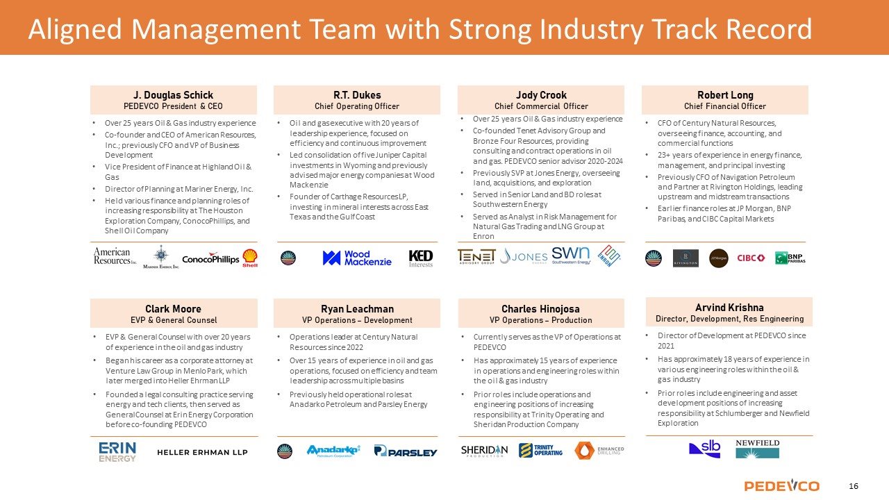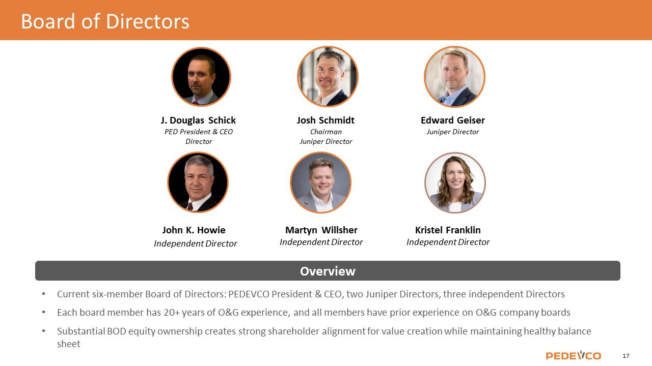 J. Douglas Schick PEDEVCO President & CEO, Director Josh Schmidt Chairman Juniper Director Board of Directors Current six-member Board of Directors: PEDEVCO President & CEO, two Juniper Directors, three independent Directors Each board member has 20+ years of O&G experience, and all members have prior experience on O&G company boards Substantial BOD equity ownership creates strong shareholder alignment for value creation while maintaining healthy balance sheet Overview