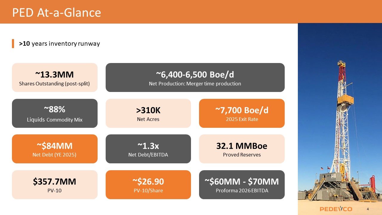 >10 years inventory runway ~13.3MM Shares Outstanding (post-split) ~88% Liquids Commodity Mix ~6,400-6,500 Boe/d Net Production: Merger time production ~7,700 Boe/d 2025 Exit Rate ~$84MM Net Debt (YE 2025) ~1.3x Net Debt/EBITDA 32.1 MMBoe Proved Reserves $357.7MM PV-10 ~$26.90 PV-10/Share ~$60MM - $70MM Proforma 2026 EBITDA >310K Net Acres 4 PED At-a-Glance
