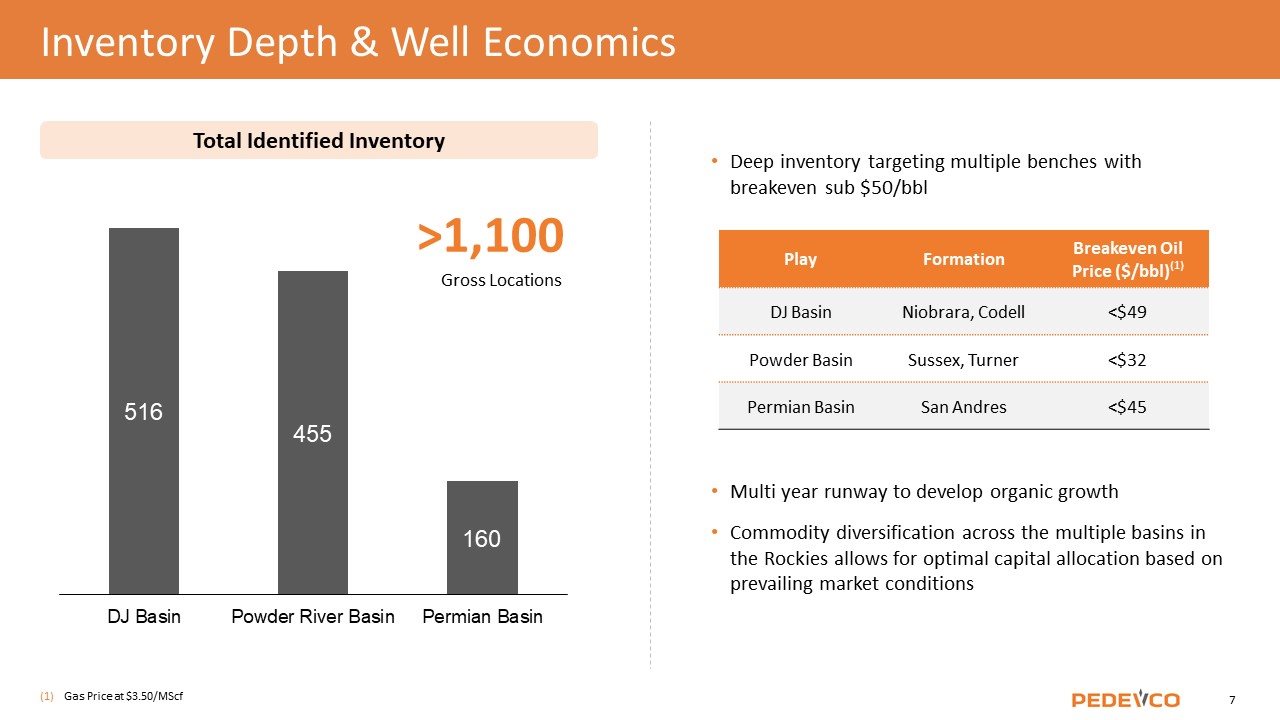 Deep inventory targeting multiple benches with breakeven sub $50/bbl Multi year runway to develop organic growth Commodity diversification across the multiple basins in the Rockies allows for optimal capital allocation based on prevailing market conditions Total Identified Inventory Inventory Depth & Well Economics >1,100 Gross Locations Gas Price at $3.50/MScf