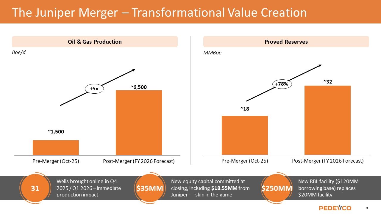 Wells brought online in Q4 2025 / Q1 2026 – immediate production impact New equity capital committed at closing, including $18.55MM from Juniper — skin in the game New RBL facility ($120MM borrowing base) replaces $20MM facility Boe/d Oil & Gas Production Pre-Merger (Oct-25) Post-Merger (FY 2026 Forecast) +5x Pre-Merger (Oct-25) Post-Merger (FY 2026 Forecast) +78% Proved Reserves MMBoe The Juniper Merger – Transformational Value Creation