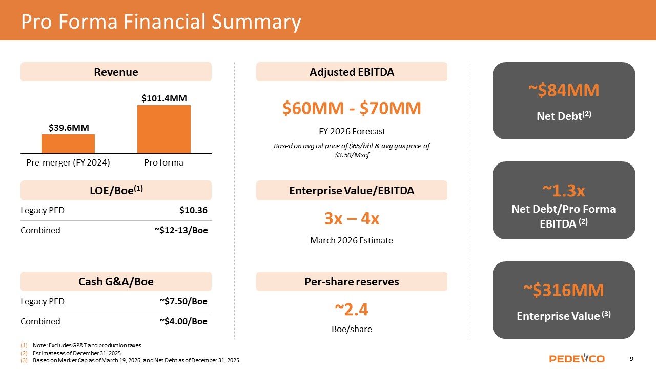 Revenue LOE/Boe(1) Combined ~$12-13/Boe Legacy PED $10.36 Pre-merger (FY 2024) Pro forma Adjusted EBITDA $60MM - $70MM FY 2026 Forecast Based on avg oil price of $65/bbl & avg gas price of $3.50/Mscf ~$84MM Net Debt(2) ~1.3x Net Debt/Pro Forma EBITDA (2) Enterprise Value/EBITDA 3x – 4x March 2026 Estimate Per-share reserves ~2.4 Cash G&A/Boe Combined ~$4.00/Boe Legacy PED ~$7.50/Boe Boe/share Note: Excludes GP&T and production taxes Estimates as of December 31, 2025 Based on Market Cap as of March 19, 2026, and Net Debt as of December 31, 2025 ~$316MM Enterprise Value (3) Pro Forma Financial Summary