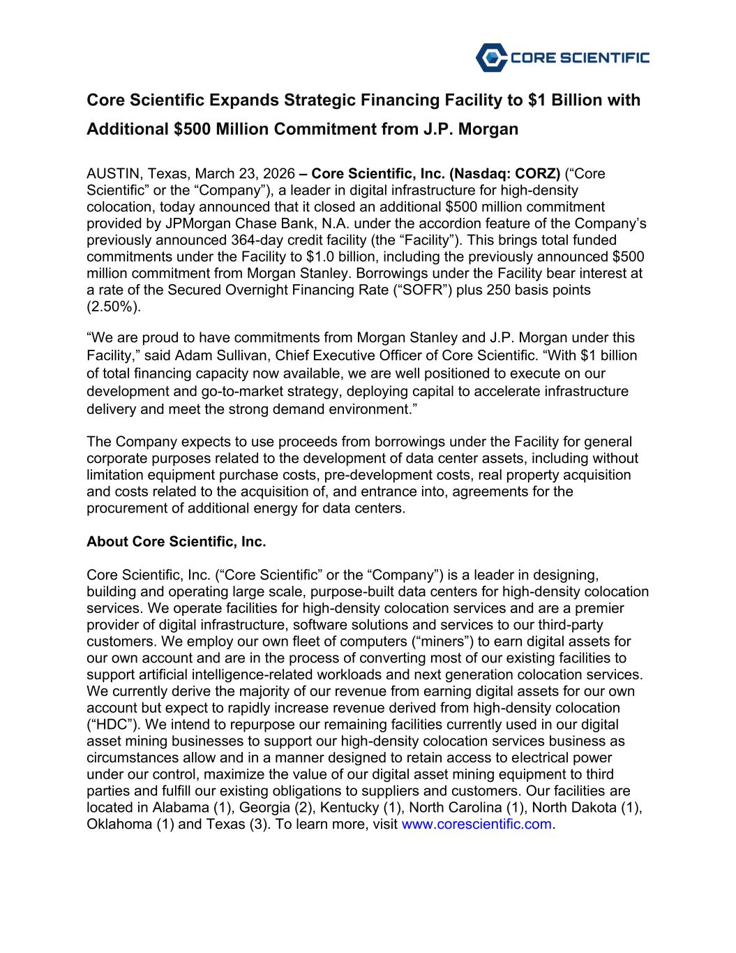 Core Scientific Expands Strategic Financing Facility to $1 Billion with Additional $500 Million Commitment from J.P. Morgan AUSTIN, Texas, March 23, 2026 – Core Scientific, Inc. (Nasdaq: CORZ) (“Core Scientific” or the “Company”), a leader in digital infrastructure for high-density colocation, today announced that it closed an additional $500 million commitment provided by JPMorgan Chase Bank, N.A. under the accordion feature of the Company’s previously announced 364-day credit facility (the “Facility”). This brings total funded commitments under the Facility to $1.0 billion, including the previously announced $500 million commitment from Morgan Stanley. Borrowings under the Facility bear interest at a rate of the Secured Overnight Financing Rate (“SOFR”) plus 250 basis points (2.50%). “We are proud to have commitments from Morgan Stanley and J.P. Morgan under this Facility,” said Adam Sullivan, Chief Executive Officer of Core Scientific. “With $1 billion of total financing capacity now available, we are well positioned to execute on our development and go-to-market strategy, deploying capital to accelerate infrastructure delivery and meet the strong demand environment.” The Company expects to use proceeds from borrowings under the Facility for general corporate purposes related to the development of data center assets, including without limitation equipment purchase costs, pre-development costs, real property acquisition and costs related to the acquisition of, and entrance into, agreements for the procurement of additional energy for data centers. About Core Scientific, Inc. Core Scientific, Inc. (“Core Scientific” or the “Company”) is a leader in designing, building and operating large scale, purpose-built data centers for high-density colocation services. We operate facilities for high-density colocation services and are a premier provider of digital infrastructure, software solutions and services to our third-party customers. We employ our own fleet of computers (“miners”) to earn digital assets for our own account and are in the process of converting most of our existing facilities to support artificial intelligence-related workloads and next generation colocation services. We currently derive the majority of our revenue from earning digital assets for our own account but expect to rapidly increase revenue derived from high-density colocation (“HDC”). We intend to repurpose our remaining facilities currently used in our digital asset mining businesses to support our high-density colocation services business as circumstances allow and in a manner designed to retain access to electrical power under our control, maximize the value of our digital asset mining equipment to third parties and fulfill our existing obligations to suppliers and customers. Our facilities are located in Alabama (1), Georgia (2), Kentucky (1), North Carolina (1), North Dakota (1), Oklahoma (1) and Texas (3). To learn more, visit www.corescientific.com.