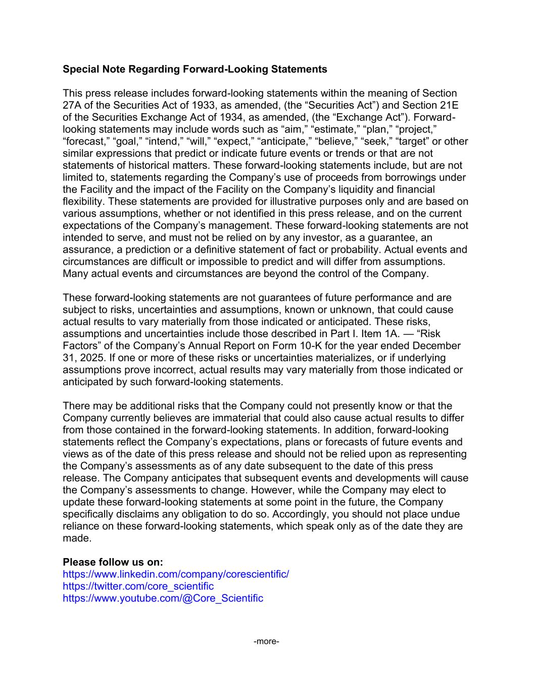 -more- Special Note Regarding Forward-Looking Statements This press release includes forward-looking statements within the meaning of Section 27A of the Securities Act of 1933, as amended, (the “Securities Act”) and Section 21E of the Securities Exchange Act of 1934, as amended, (the “Exchange Act”). Forward- looking statements may include words such as “aim,” “estimate,” “plan,” “project,” “forecast,” “goal,” “intend,” “will,” “expect,” “anticipate,” “believe,” “seek,” “target” or other similar expressions that predict or indicate future events or trends or that are not statements of historical matters. These forward-looking statements include, but are not limited to, statements regarding the Company’s use of proceeds from borrowings under the Facility and the impact of the Facility on the Company’s liquidity and financial flexibility. These statements are provided for illustrative purposes only and are based on various assumptions, whether or not identified in this press release, and on the current expectations of the Company’s management. These forward-looking statements are not intended to serve, and must not be relied on by any investor, as a guarantee, an assurance, a prediction or a definitive statement of fact or probability. Actual events and circumstances are difficult or impossible to predict and will differ from assumptions. Many actual events and circumstances are beyond the control of the Company. These forward-looking statements are not guarantees of future performance and are subject to risks, uncertainties and assumptions, known or unknown, that could cause actual results to vary materially from those indicated or anticipated. These risks, assumptions and uncertainties include those described in Part I. Item 1A. — “Risk Factors” of the Company’s Annual Report on Form 10-K for the year ended December 31, 2025. If one or more of these risks or uncertainties materializes, or if underlying assumptions prove incorrect, actual results may vary materially from those indicated or anticipated by such forward-looking statements. There may be additional risks that the Company could not presently know or that the Company currently believes are immaterial that could also cause actual results to differ from those contained in the forward-looking statements. In addition, forward-looking statements reflect the Company’s expectations, plans or forecasts of future events and views as of the date of this press release and should not be relied upon as representing the Company’s assessments as of any date subsequent to the date of this press release. The Company anticipates that subsequent events and developments will cause the Company’s assessments to change. However, while the Company may elect to update these forward-looking statements at some point in the future, the Company specifically disclaims any obligation to do so. Accordingly, you should not place undue reliance on these forward-looking statements, which speak only as of the date they are made. Please follow us on: https://www.linkedin.com/company/corescientific/ https://twitter.com/core_scientific https://www.youtube.com/@Core_Scientific