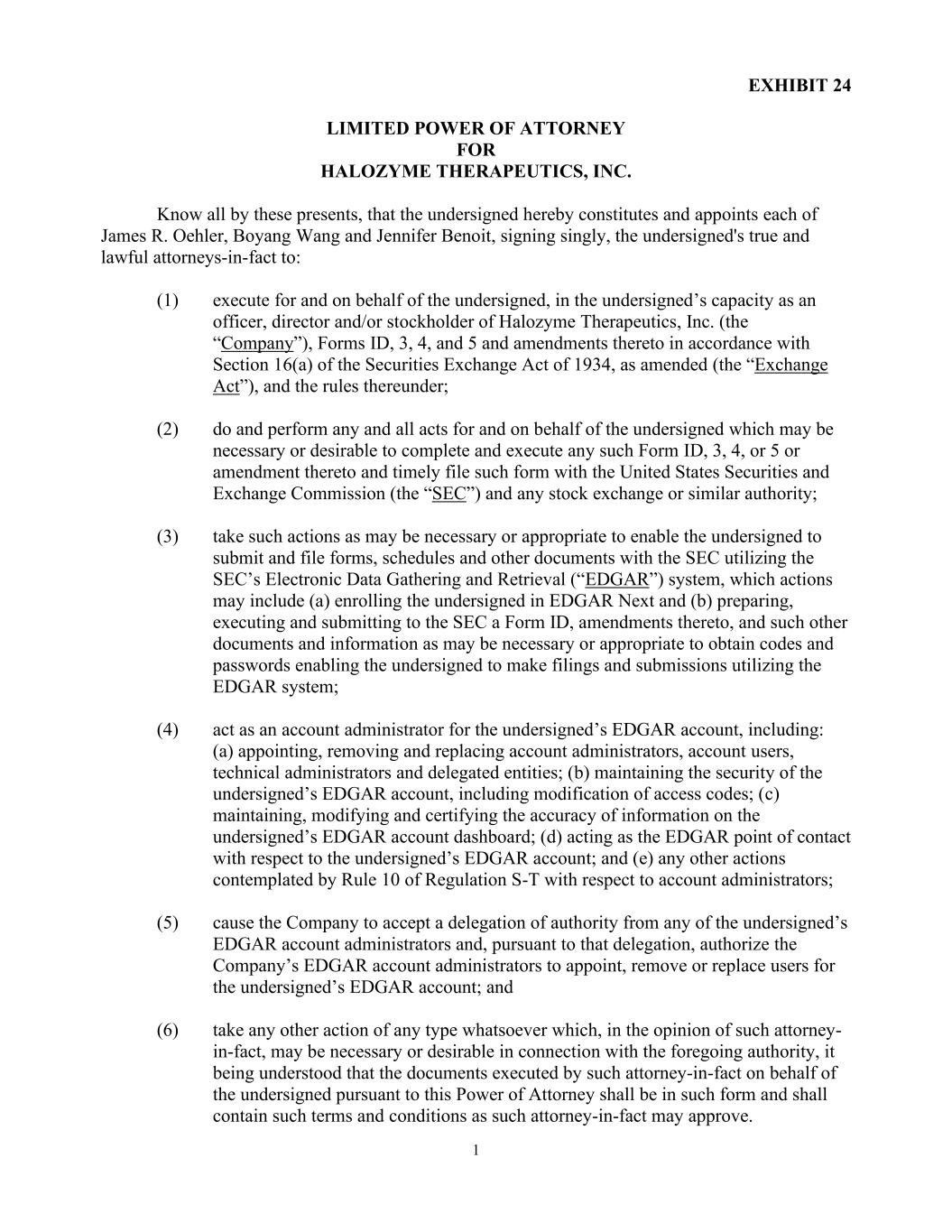 1 EXHIBIT 24 LIMITED POWER OF ATTORNEY FOR HALOZYME THERAPEUTICS, INC. Know all by these presents, that the undersigned hereby constitutes and appoints each of James R. Oehler, Boyang Wang and Jennifer Benoit, signing singly, the undersigned's true and lawful attorneys-in-fact to: (1) execute for and on behalf of the undersigned, in the undersigned’s capacity as an officer, director and/or stockholder of Halozyme Therapeutics, Inc. (the “Company”), Forms ID, 3, 4, and 5 and amendments thereto in accordance with Section 16(a) of the Securities Exchange Act of 1934, as amended (the “Exchange Act”), and the rules thereunder; (2) do and perform any and all acts for and on behalf of the undersigned which may be necessary or desirable to complete and execute any such Form ID, 3, 4, or 5 or amendment thereto and timely file such form with the United States Securities and Exchange Commission (the “SEC”) and any stock exchange or similar authority; (3) take such actions as may be necessary or appropriate to enable the undersigned to submit and file forms, schedules and other documents with the SEC utilizing the SEC’s Electronic Data Gathering and Retrieval (“EDGAR”) system, which actions may include (a) enrolling the undersigned in EDGAR Next and (b) preparing, executing and submitting to the SEC a Form ID, amendments thereto, and such other documents and information as may be necessary or appropriate to obtain codes and passwords enabling the undersigned to make filings and submissions utilizing the EDGAR system; (4) act as an account administrator for the undersigned’s EDGAR account, including: (a) appointing, removing and replacing account administrators, account users, technical administrators and delegated entities; (b) maintaining the security of the undersigned’s EDGAR account, including modification of access codes; (c) maintaining, modifying and certifying the accuracy of information on the undersigned’s EDGAR account dashboard; (d) acting as the EDGAR point of contact with respect to the undersigned’s EDGAR account; and (e) any other actions contemplated by Rule 10 of Regulation S-T with respect to account administrators; (5) cause the Company to accept a delegation of authority from any of the undersigned’s EDGAR account administrators and, pursuant to that delegation, authorize the Company’s EDGAR account administrators to appoint, remove or replace users for the undersigned’s EDGAR account; and (6) take any other action of any type whatsoever which, in the opinion of such attorney- in-fact, may be necessary or desirable in connection with the foregoing authority, it being understood that the documents executed by such attorney-in-fact on behalf of the undersigned pursuant to this Power of Attorney shall be in such form and shall contain such terms and conditions as such attorney-in-fact may approve.