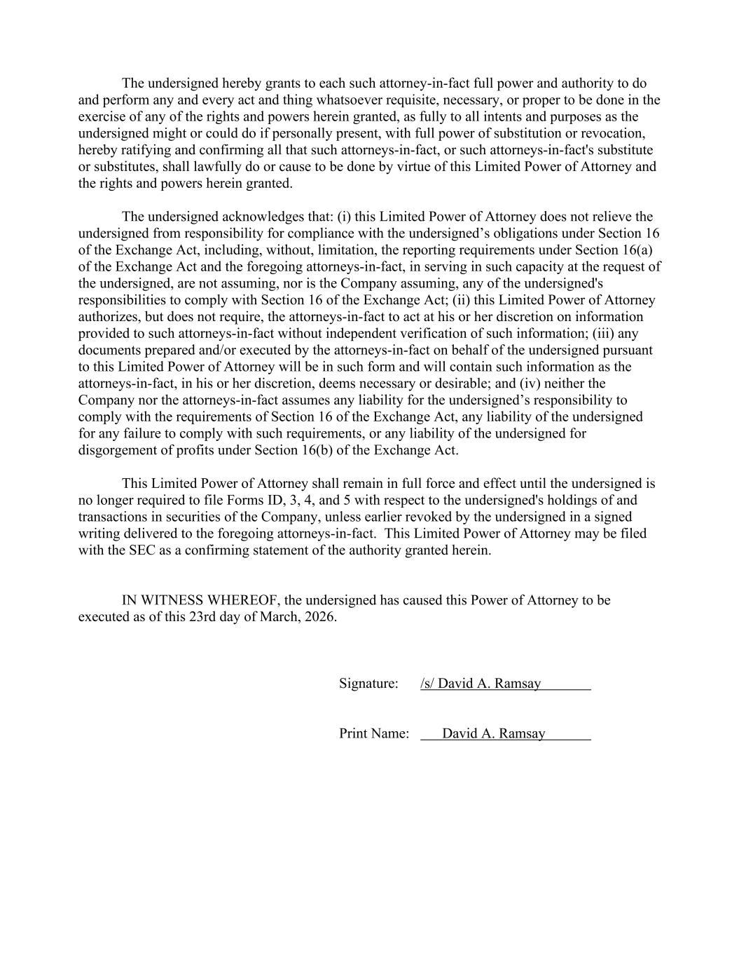 The undersigned hereby grants to each such attorney-in-fact full power and authority to do and perform any and every act and thing whatsoever requisite, necessary, or proper to be done in the exercise of any of the rights and powers herein granted, as fully to all intents and purposes as the undersigned might or could do if personally present, with full power of substitution or revocation, hereby ratifying and confirming all that such attorneys-in-fact, or such attorneys-in-fact's substitute or substitutes, shall lawfully do or cause to be done by virtue of this Limited Power of Attorney and the rights and powers herein granted. The undersigned acknowledges that: (i) this Limited Power of Attorney does not relieve the undersigned from responsibility for compliance with the undersigned’s obligations under Section 16 of the Exchange Act, including, without, limitation, the reporting requirements under Section 16(a) of the Exchange Act and the foregoing attorneys-in-fact, in serving in such capacity at the request of the undersigned, are not assuming, nor is the Company assuming, any of the undersigned's responsibilities to comply with Section 16 of the Exchange Act; (ii) this Limited Power of Attorney authorizes, but does not require, the attorneys-in-fact to act at his or her discretion on information provided to such attorneys-in-fact without independent verification of such information; (iii) any documents prepared and/or executed by the attorneys-in-fact on behalf of the undersigned pursuant to this Limited Power of Attorney will be in such form and will contain such information as the attorneys-in-fact, in his or her discretion, deems necessary or desirable; and (iv) neither the Company nor the attorneys-in-fact assumes any liability for the undersigned’s responsibility to comply with the requirements of Section 16 of the Exchange Act, any liability of the undersigned for any failure to comply with such requirements, or any liability of the undersigned for disgorgement of profits under Section 16(b) of the Exchange Act. This Limited Power of Attorney shall remain in full force and effect until the undersigned is no longer required to file Forms ID, 3, 4, and 5 with respect to the undersigned's holdings of and transactions in securities of the Company, unless earlier revoked by the undersigned in a signed writing delivered to the foregoing attorneys-in-fact. This Limited Power of Attorney may be filed with the SEC as a confirming statement of the authority granted herein. IN WITNESS WHEREOF, the undersigned has caused this Power of Attorney to be executed as of this 23rd day of March, 2026. Signature: /s/ David A. Ramsay Print Name: David A. Ramsay