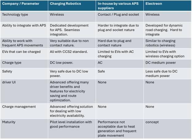 Below is a competitive analysis of our solution in comparison to other EV charging technologies, either existing or currently in development. Analysis is based on the Company’s best knowledge and understating.