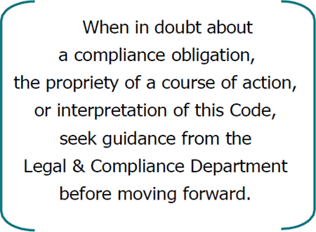 If you have any questions about the Code or require additional guidance, please speak with your manager, Compliance, or other appropriate contacts referenced in this Code.